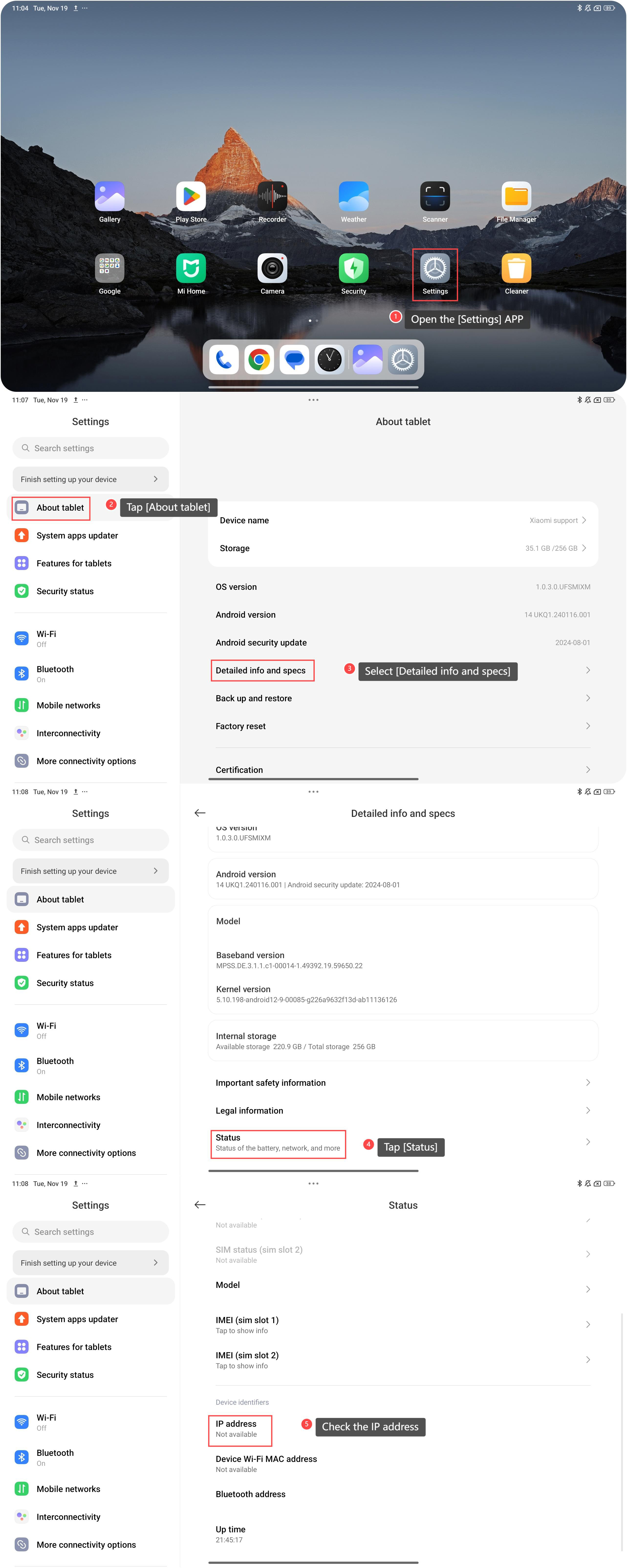 IP stands for Internet Protocol, which is the set of rules governing the format of data sent via the internet or local network. The IP address uniquely identifies your tablet on a network. It acts as a label for your device, allowing your tablet to send and receive data to and from other devices on the same network, whether it's a local Wi-Fi network or a cellular network. To check the IP address on the Redmi Pad Pro 5G, please refer to the following steps: 1.Open the [Settings] APP on your tablet; 2. Tap [About tablet] located at the top of the settings menu; 3.Select[Detailed info and specs]; 4.Scroll down and tap [Status]; 5. Then you cancheck the IP addresshere.