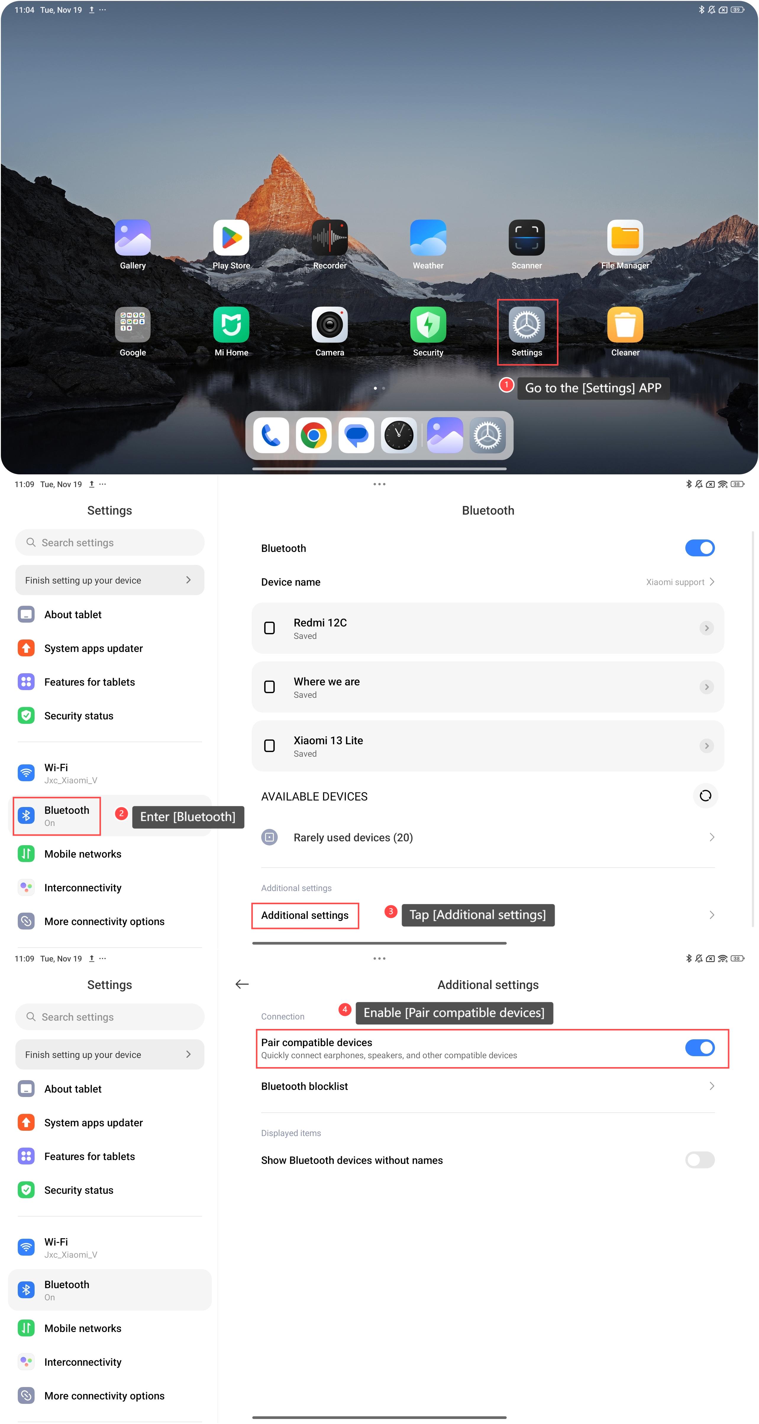 Quick pairing with Bluetooth devices allows the Redmi Pad Pro5G to connect quickly and effortlessly with other Bluetooth-enabled devices, ensuring a seamless and hassle-free experience when syncing with headphones, speakers, or other accessories for enhanced functionality and convenience. To quickly pair your tablet to other Bluetooth devices, please refer to the following steps: 1. Go to the [Settings] APP on your tablet; 2. Enter [Bluetooth]; 3. Tap [Additional settings]; 4. Enable [Pair compatible devices] and then you can quickly connect earphones, speakers, and other compatible devices. Note: This function’s main purpose is to save time by eliminating the need for manual searches and entering pairing codes, making it easier to connect and use devices. For instance, headphones and speakers can quickly link to the tablet for seamless audio experiences.