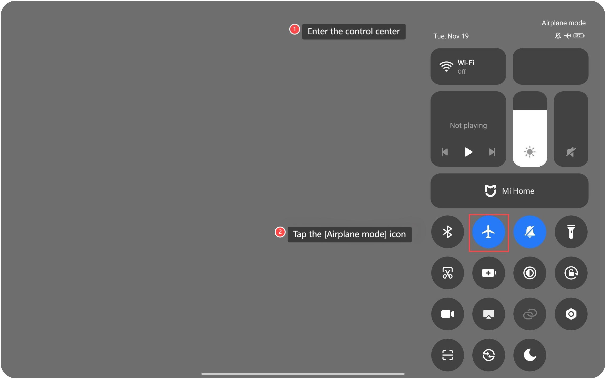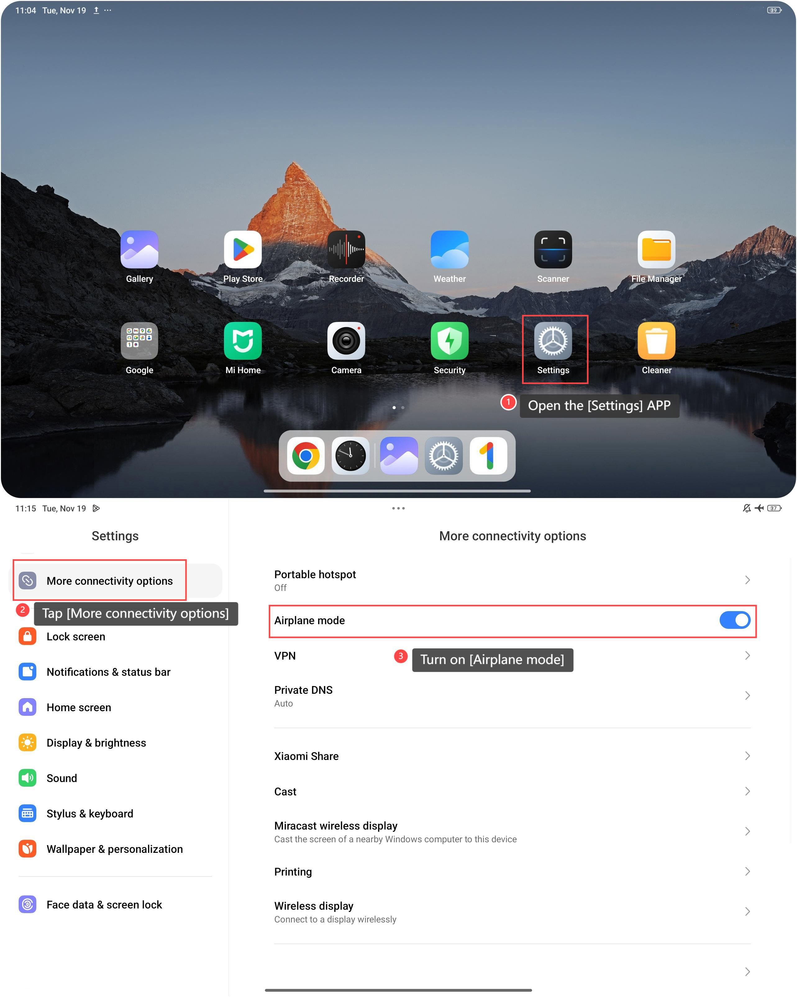 The Redmi Pad Pro supports the airplane mode, which turns off cellular, Wi-Fi, and Bluetooth connections, preventing the device from sending or receiving signals. By disabling these connections, it helps conserve battery life during travel or when not in use. Besides, it reduces the risk of interference with aircraft systems during flights, complying with airline regulations. To turn on the Airplane mode on your tablet, please refer to the following methods: Method 1: 1. Open the [Settings] APP on your device. You can find the gear icon on your home screen or in your APP drawer; 2. Tap [More connectivity options]; 3. Turn on [Airplane mode]. Method 2: 1. Swipe down from the right top of the screen to enter the control center; 2. Tap the [Airplane mode] icon to turn on it.