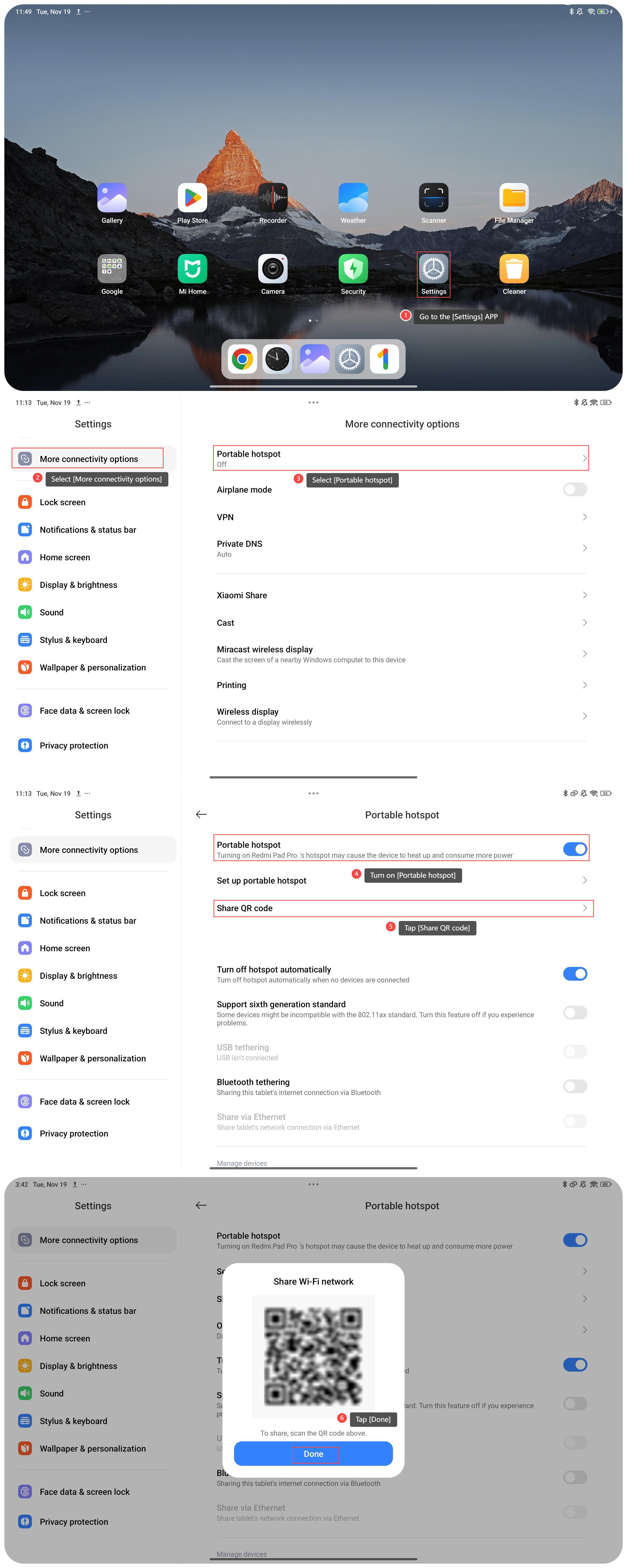 The Redmi Pad Pro supports the built-in feature of enabling a portable hotspot thatallows you to turn your tablet into a mobile Wi-Fi hotspot, enabling other devices to connect to the internet. Aimed to bring your convenience and improve your using experience, you can select to share the hotspot QR code to help other devices connect to the network quickly without manually searching the Wi-Fi and entering the password. To share the hotspot QR code on your device, please refer to the following steps: 1. Go to the [Settings]APPon your tablet; 2. Scroll down and select [More connectivity options]; 3. Select [Portable hotspot]; 4. Turn on [Portable hotspot]; 5. Tap [Share QR code]; 6. Then the other device can scan the hotspot QR code of your device and tap [Done].