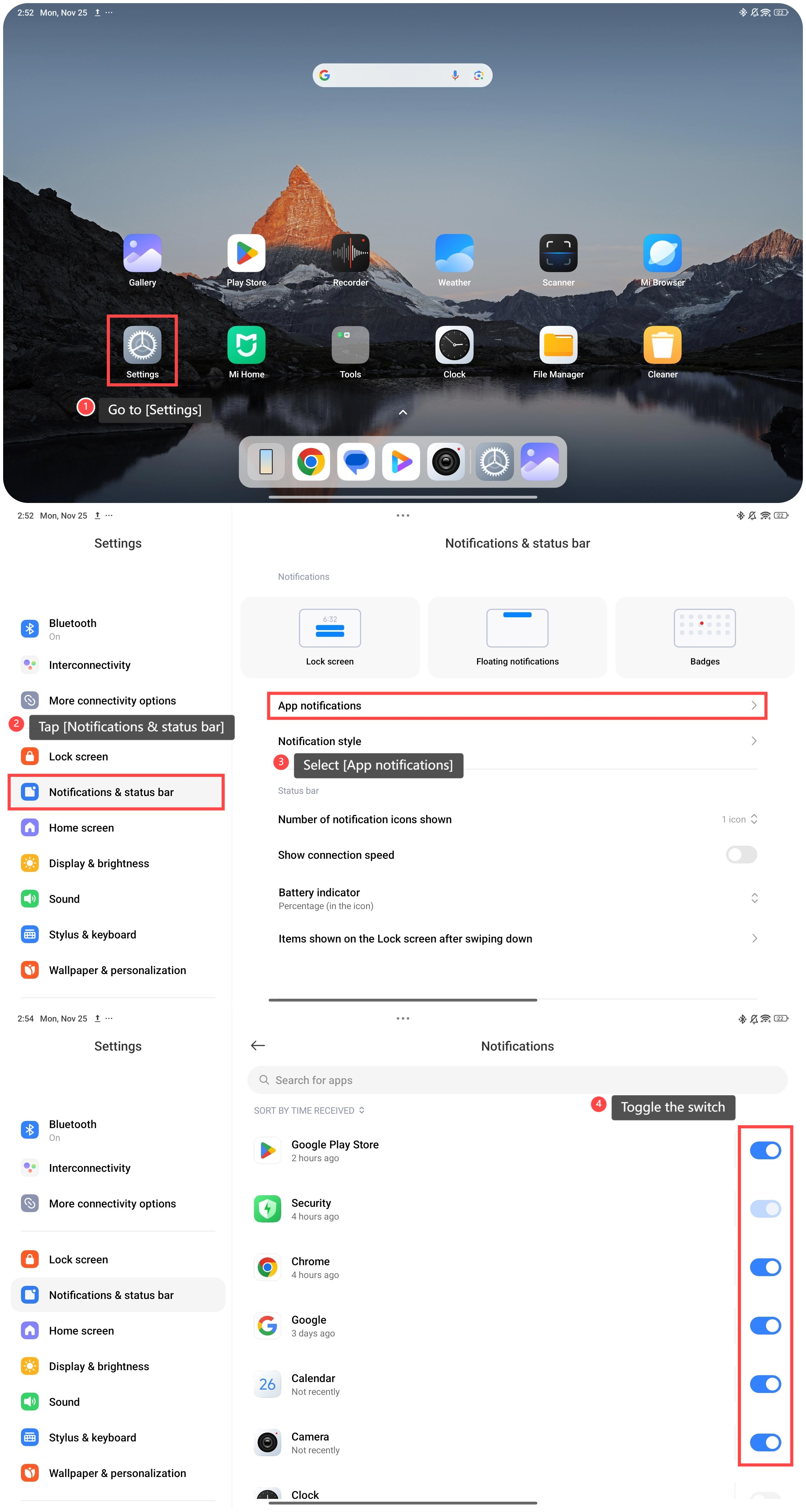 APP notifications on the Redmi Pad Pro are alerts generated by installed apps to inform you about updates, reminders, or actions that require your attention.They appear in the notification shade, lock screen, or as banners depending on your settings,allowing you to stay connected and informed. To manage APP notifications on your tablet, please refer to the following steps: 1. Go to [Settings]; 2. Scroll down and tap[Notifications & status bar]; 3. Select [App notifications] and you will see a list of APPs that are sorted by time received; 4. Look for the APP for which you want to manage notifications and toggle the switch next to the specific APP according to your preference. Note: You can set priority for important application or events, such as messages or calendar alerts, and disable notifications for less urgent apps.