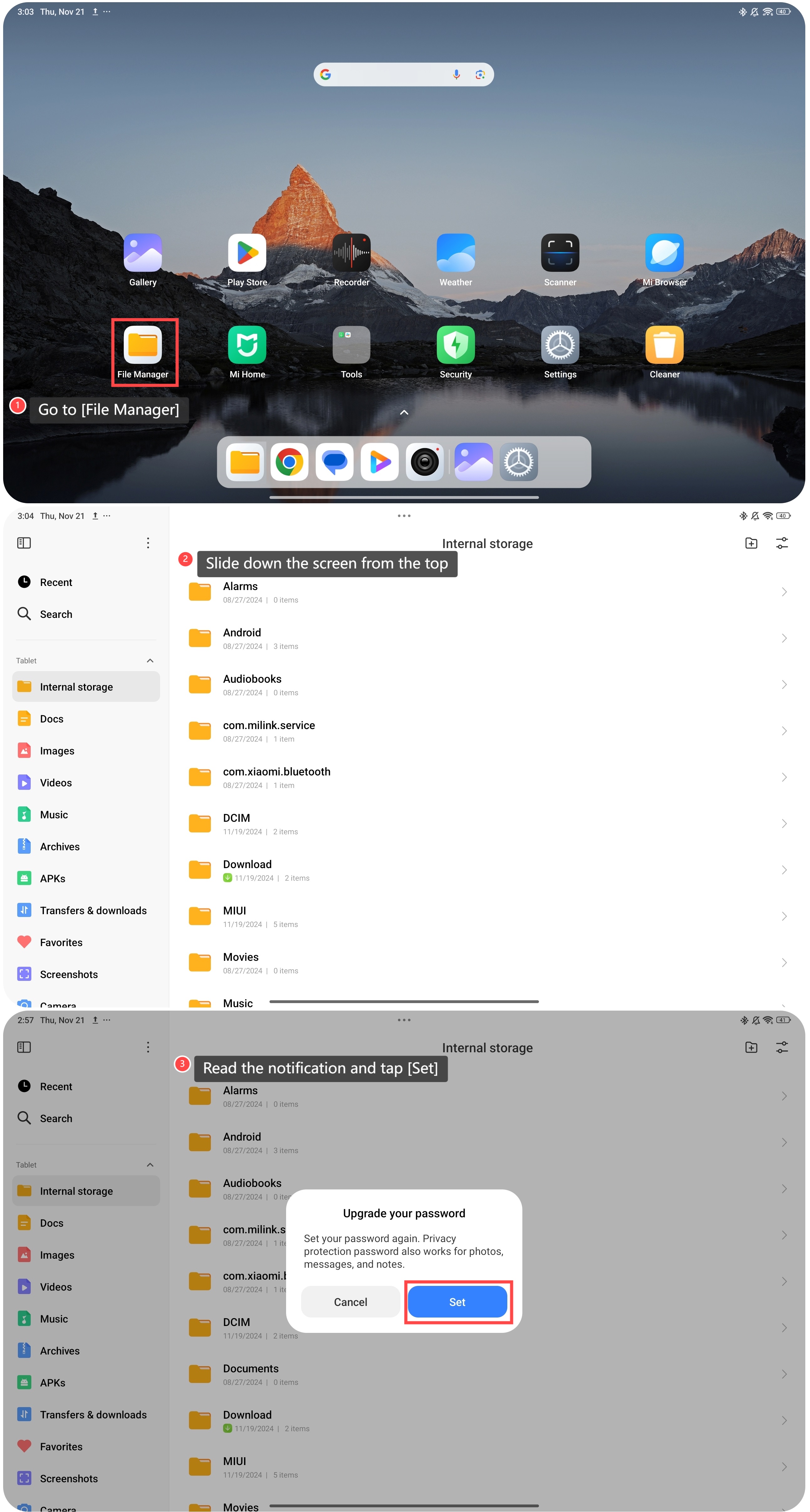 The private files on the Redmi Pad Pro refer to files that you want to keep hidden or secure so that only you can access them. It also allows you to prevent important files from being accidentally deleted or modified, providing an extra layer of protection. To make and check the private files on the tablet, please refer to the following steps: 1. Go to [File Manager]; 2. Slide down the screen from the top then the screen prompts you to release to view private files; 3. If this is your first time accessing private files, please read the notification and tap [Set]. Draw your privacy protection password, then tap [Make files private] to make the private files; 4. Tap [Internal shared storage]; 5. Select the files for which you want to make them private; 6. Tap [Make private] to confirm your selection.
