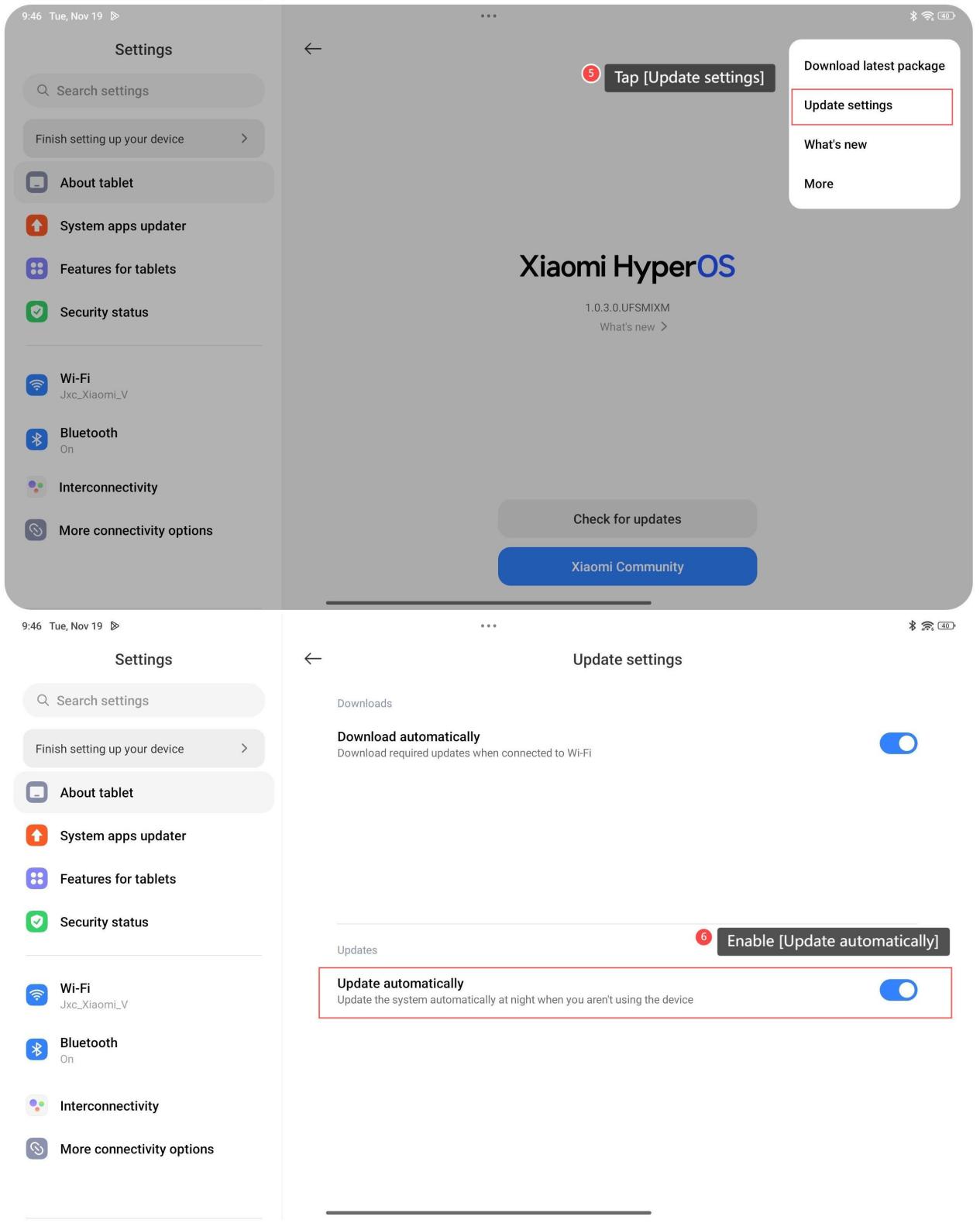 The Redmi Pad Pro can update the system automatically, saving you time and ensuring that you have access to the latest features without needing to go into settings or download the latest version manually. This makes the updating process more convenient and efficient, keeping your device up-to-date to meet your needs. To update the system of your tablet automatically, please refer to the following steps: 1. Go to the[Settings]APP on your tablet; 2. Tap [About tablet]; 3. Tap the [Xiaomi HyperOS] icon; 4. Tap the three-dot icon at the right top of the screen; 5. Tap [Update settings]; 6. Enable[Update automatically] and the tablet will be updated automatically at night when the tablet is not used.