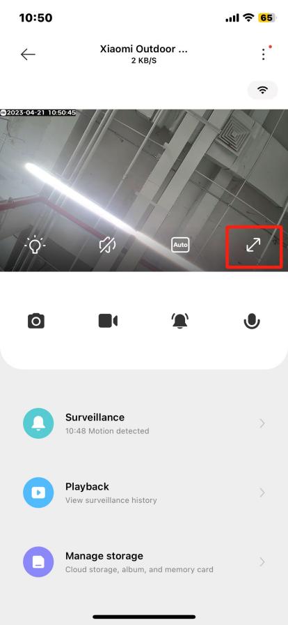 The real-time monitoring interface of the Xiaomi Outdoor Camera AW300 features many icons for different functions. The icons on the monitoring interface appear only when you tap on the live screen, otherwise, they remain hidden. For your reference, the meanings of the functional icons are listed below: 1. White light: When turned on, the device will keep the white light on for 30 seconds before automatically turning it off; 2. Mute/Unmute function: The default is muted. Tap the icon to unmute and turn on sound. Tap again to restore mute; 3. Video quality switch: Tap the[Auto] icon to switch between [360psmooth],[2K HD], and [Auto](quality switches based on network environment); 4. Fullscreen icon: Tap to enter fullscreen mode on the monitoring interface.