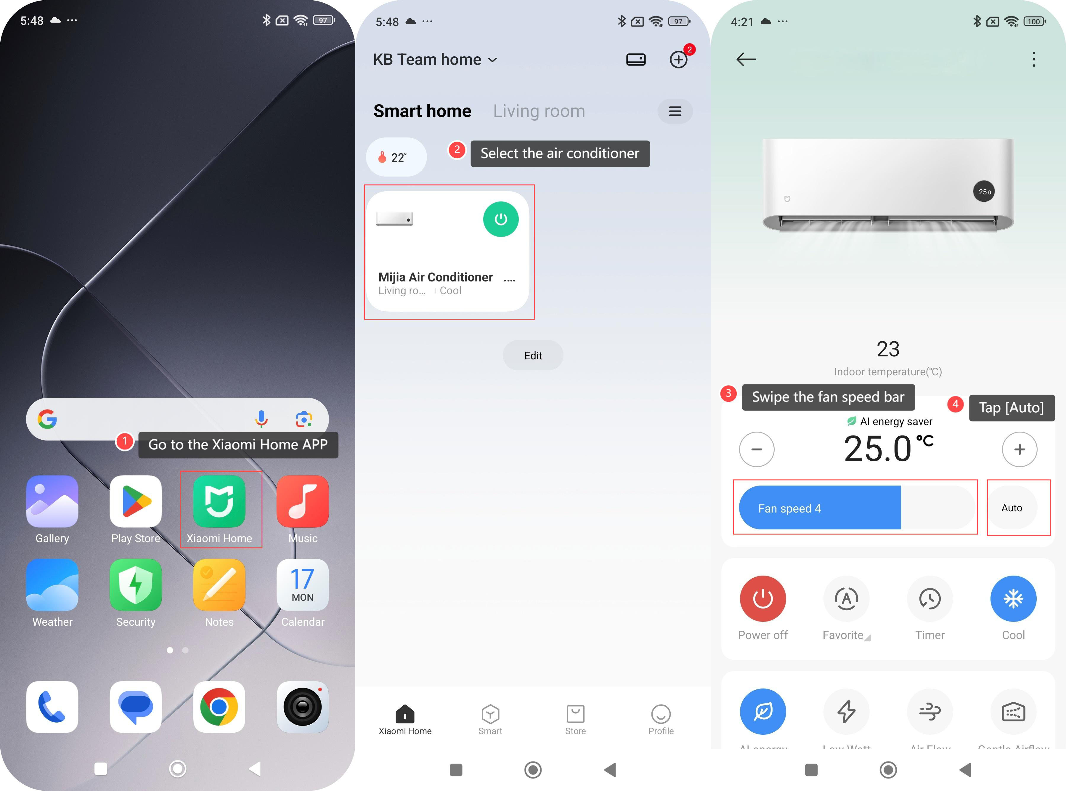 The air conditioner supports adjusting the fan speed on the Xiaomi Home APP or through pressing the button on the remote control, which can help you easily adjust the fan speed to the desired level. To adjust the fan speed on the air conditioner, please refer to the following methods: Method 1: 1. Go to the Xiaomi Home APP; 2. Select the air conditioner; 3. Swipe the fan speed bar left or right to adjust the fan speed; 4. You can also tap [Auto] and the fan speed will be adjusted automatically. Method 2: Press the Fan Speed Button on the remote control to adjust the speed: automatic, quite (level 1), low (level 2), low-medium (level 3), medium (level 4), medium-high (level 5), high (level 6), super-high (level 7). Note: The fan speed is not adjustable in Dry mode.