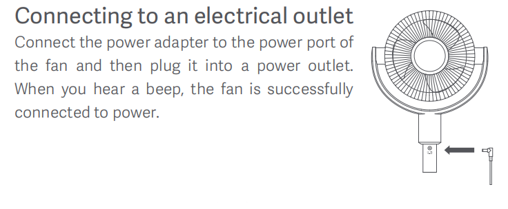 Product Introduction and Usage 1.Q: How to turn on and off the Xiaomi Smart Standing Air Circulation Fan? A: Connect the power adapter to the power port of the fan and then plug it into a powersocket. When you hear a beep, the fan is successfully connected to power.