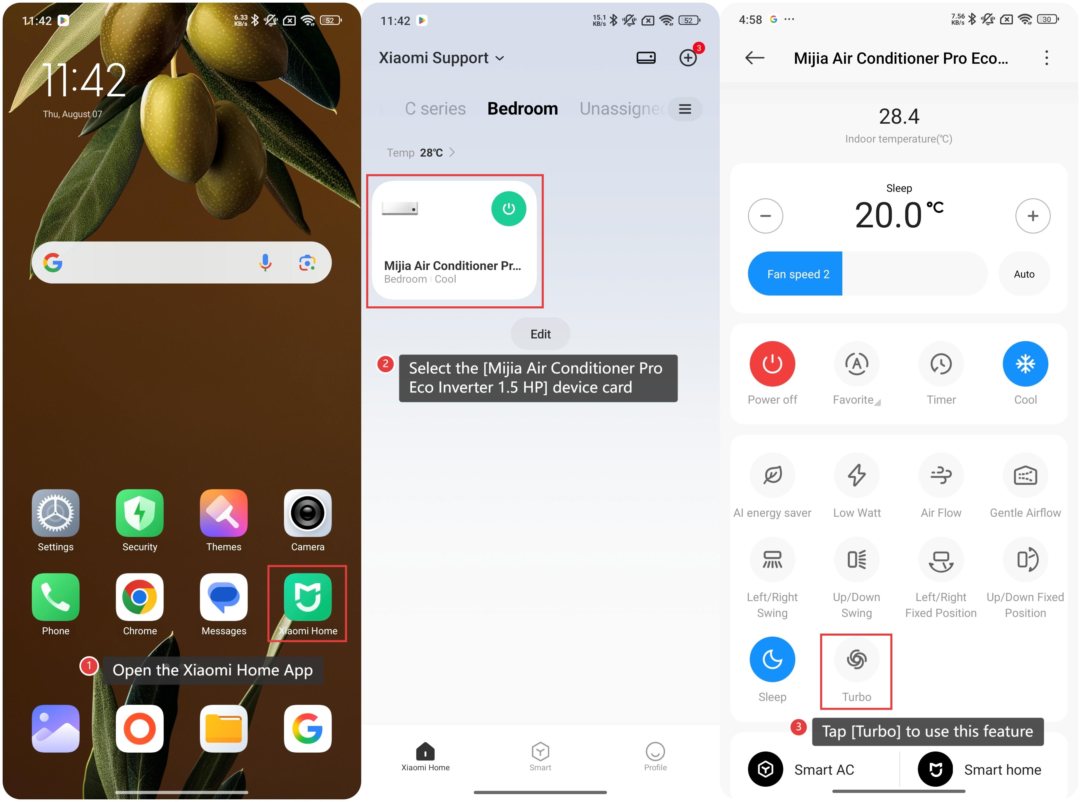 Turbo mode maximizes the cooling power of the Mijia Air Conditioner Pro Eco Inverter 1.5 HP at the press of a button. Once activated, the system adjusts the compressor frequency and fan speed to their highest levels, enabling rapid cooling. To use the Turbo mode on the Mijia Air Conditioner Pro Eco Inverter 1.5 HP, please refer to the following methods: Method 1: Once the Mijia Air Conditioner Pro Eco Inverter 1.5 HP is powered on and running normally, press the Turbo button on the remote control to enable or disable Turbo mode. Method 2: 1. Open the Xiaomi Home App on your device; 2. Select the [Mijia Air Conditioner Pro Eco Inverter 1.5 HP] device card; 3. Tap [Turbo] to use this feature.