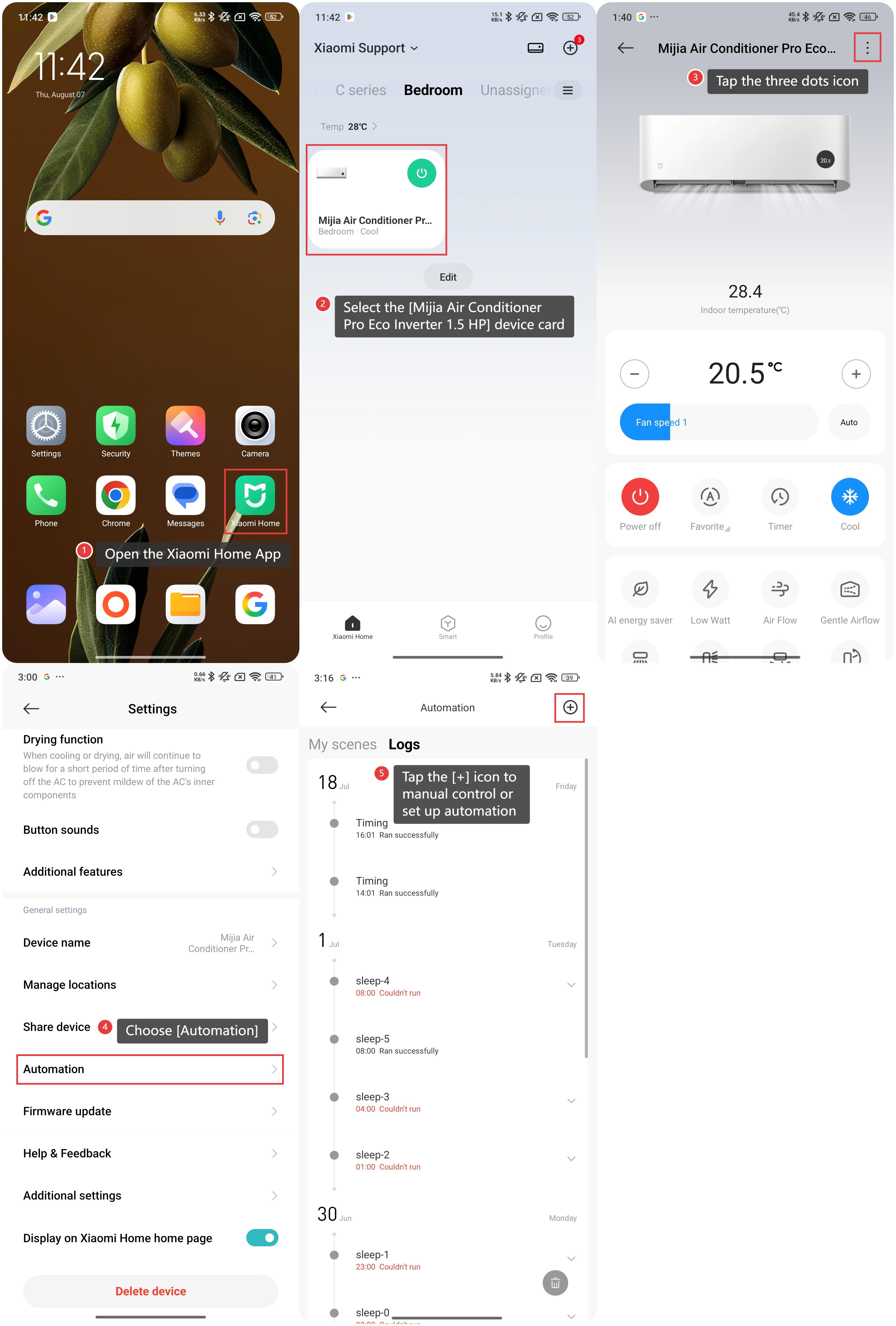 This Mijia Air Conditioner Pro Eco Inverter 1.5 HP supports smart scene settings, allowing it to be linked with other smart devices for automation. To link the Mijia Air Conditioner Pro Eco Inverter 1.5 HP with other devices, please refer to the following information: 1. Open the Xiaomi Home App on your device; 2. Select the [Mijia Air Conditioner Pro Eco Inverter 1.5 HP] device card; 3. Tap the three dots icon at the upper right corner; 4. Choose [Automation]; 5. Tap the [+] icon at the upper right corner to manual control or set up automation.