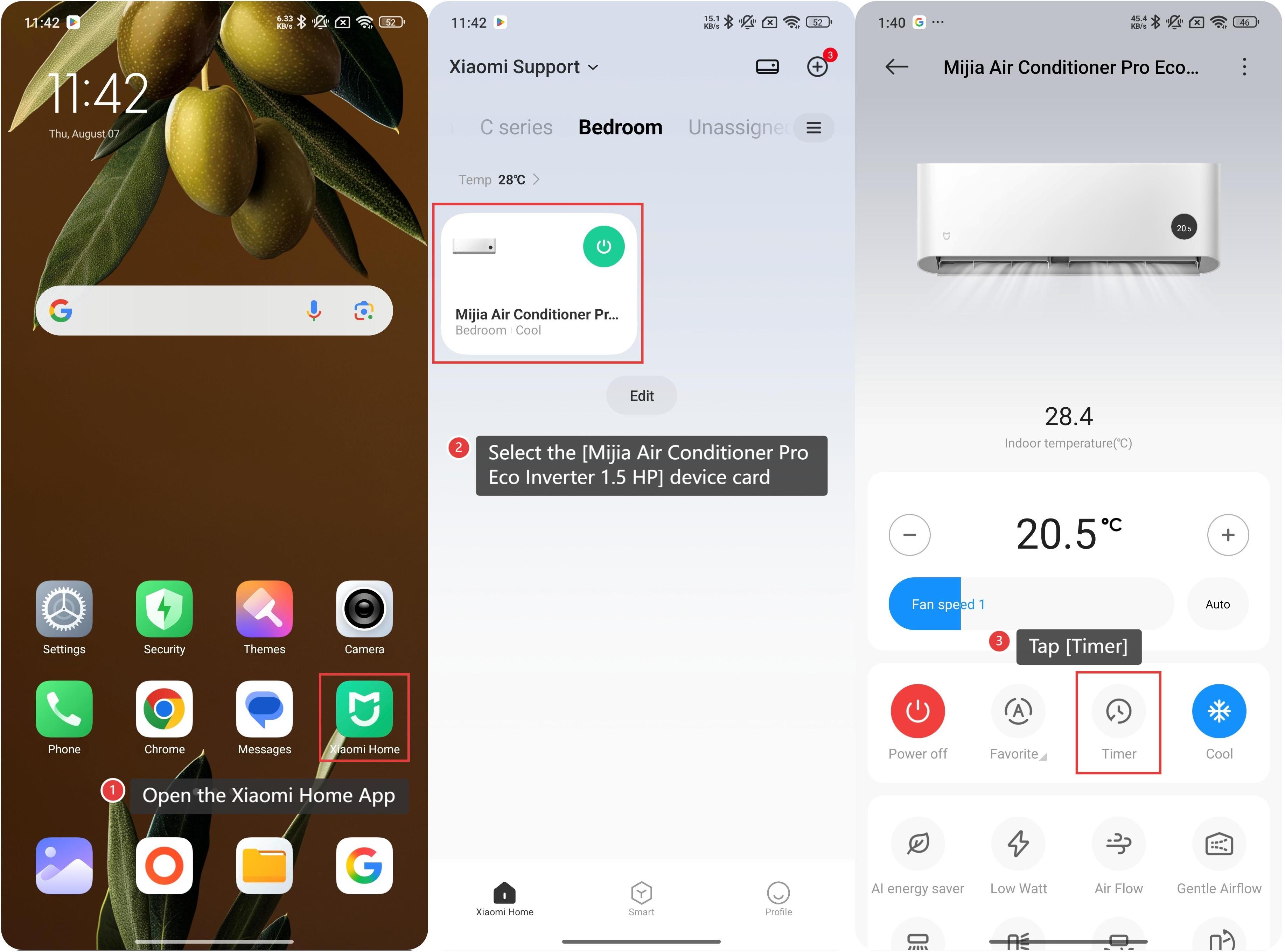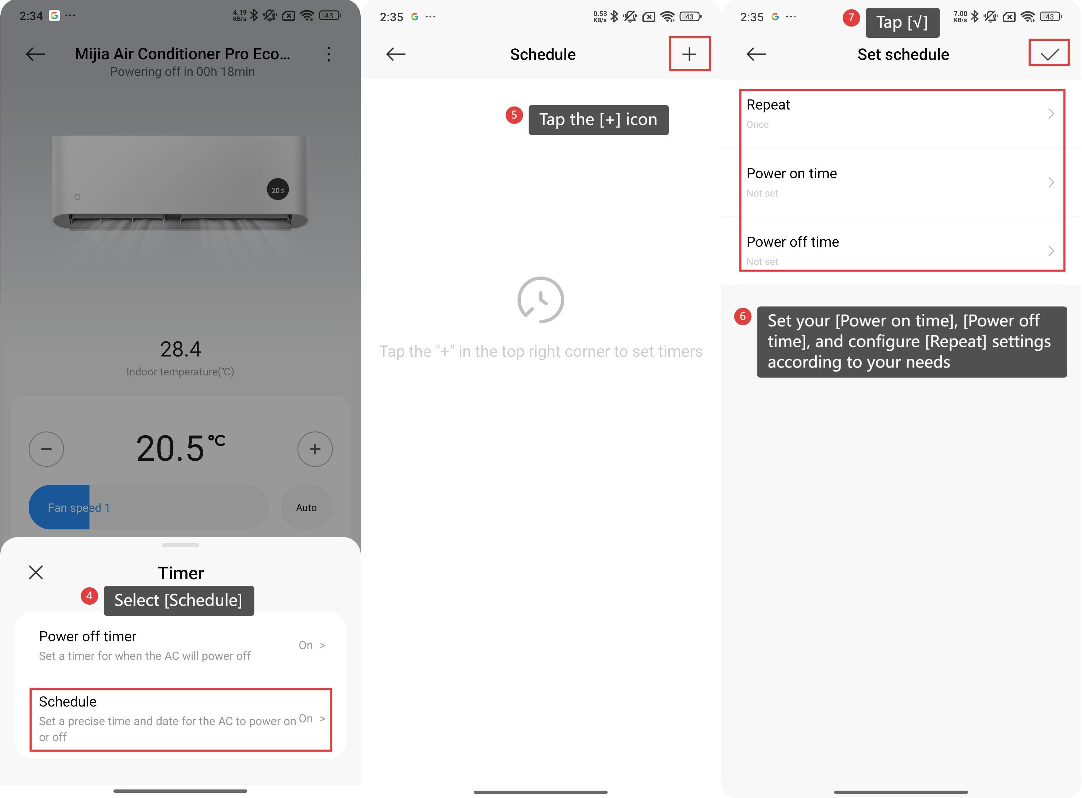 The Mijia Air Conditioner Pro Eco Inverter 1.5 HP supports timer functions for scheduled power-on and power-off. You can set the timer using either the remote control or the Xiaomi Home App based on your preference. To set a timer for turning the Mijia Air Conditioner Pro Eco Inverter 1.5 HP on or off with the remote control, please refer to the following information: 1. While the Mijia Air Conditioner Pro Eco Inverter 1.5 HP is in standby or running mode, press the [Timer] button and use the [+] or [-] buttons to select your desired time. The setting will automatically confirm and take effect after 2 seconds; 2. When the air conditioner is turned on, you can set an auto-off timer, and when it is off, you can set an auto turn-on timer. To set a timer for turning the Mijia Air Conditioner Pro Eco Inverter 1.5 HP on or off via the Xiaomi Home App, please refer to the following information: 1. Open the Xiaomi Home App on your device; 2. Select the [Mijia Air Conditioner Pro Eco Inverter 1.5 HP] device card; 3. Tap [Timer]; 4. Select [Power off timer] or [Power on timer]; 5. Set your preferred time and tap [Confirm]. You can also create a schedule for the air conditioner to automatically power on or off at your desired time and date. Please refer to the following steps to set the schedule of the Mijia Air Conditioner Pro Eco Inverter 1.5 HP: 1. Open the Xiaomi Home App on your device; 2. Select the [Mijia Air Conditioner Pro Eco Inverter 1.5 HP] device card; 3. Tap [Timer]; 4. Select [Schedule]; 5. Tap the [+] icon at the upper right corner; 6. Set your [Power on time], [Power off time], and configure [Repeat] settings according to your needs; 7. Tap the [√] icon to save your schedule.