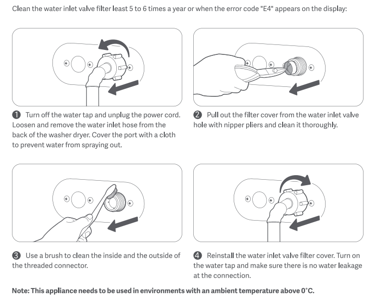 (4). Reinstall the water inlet valve filter cover. Turn on the water tap and make sure there is no water leakage at the connection.