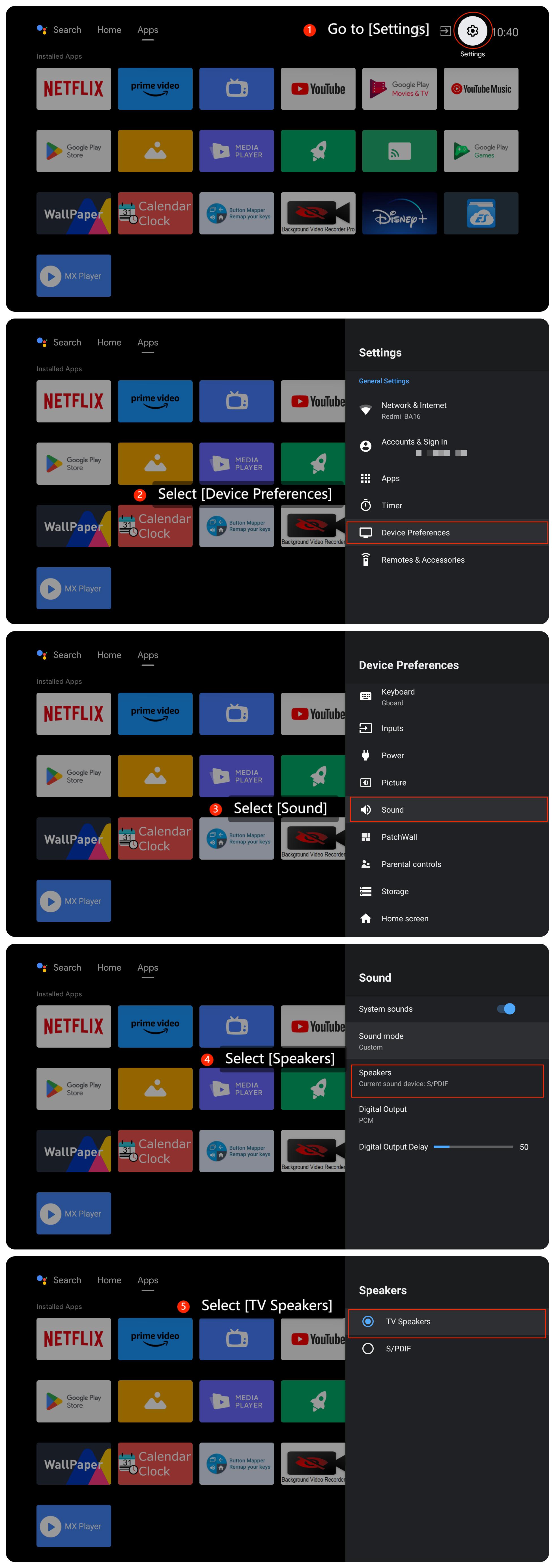 If the sound on your Xiaomi TV A2 50changes dramatically, please refer to the following scenarios and their troubleshooting methods: Scenario 1: If the issue occurs while you are using the built-in speaker of your TV, please refer to the following steps: 1. Checkif audio settings are correctly configured by going to [Settings] >>[Device Preferences]>>[Sound] >> adjust[Sound mode]and[Digital Output Delay]; 2. Check if the current speaker is correctly set by going to [Settings] >>[Device preferences] >> [Sound] >> [Speakers] >>[TV Speakers]; 3. Ensure your TV is running on the latest system by navigating to [Settings] >> [Device Preferences] >> [About] >> [System update]; 4. Try playing different types of content such as movies, TV shows, and music to see if the issue is consistent across all sources, which can help determine if the issue is content-specific; 5. As a last resort, you can try performing a factory reset on your TV. Be aware that this will erase all your settings and data, so make sure to back up any important data before proceeding. Go to [Settings] >>[Device Preferences]>>[Reset].