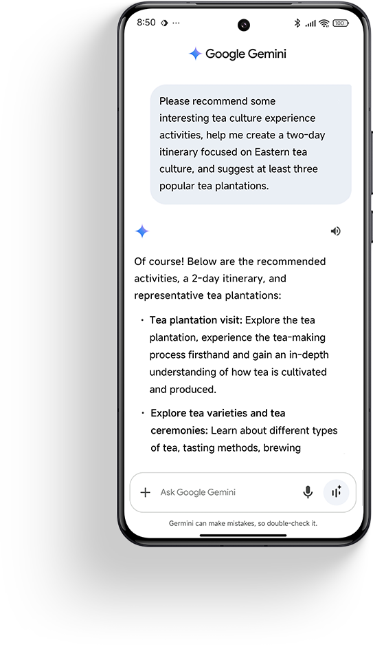 Chat with Gemini, your AI assistant from Google, to help plan your tea plantation journey.