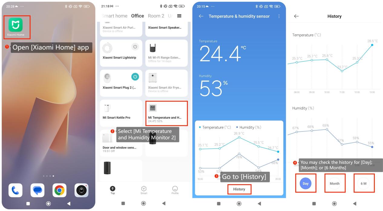To check the daily/monthly/half-year temperature and humidity records for Mi Temperature and Humidity Monitor 2, please follow the steps below: