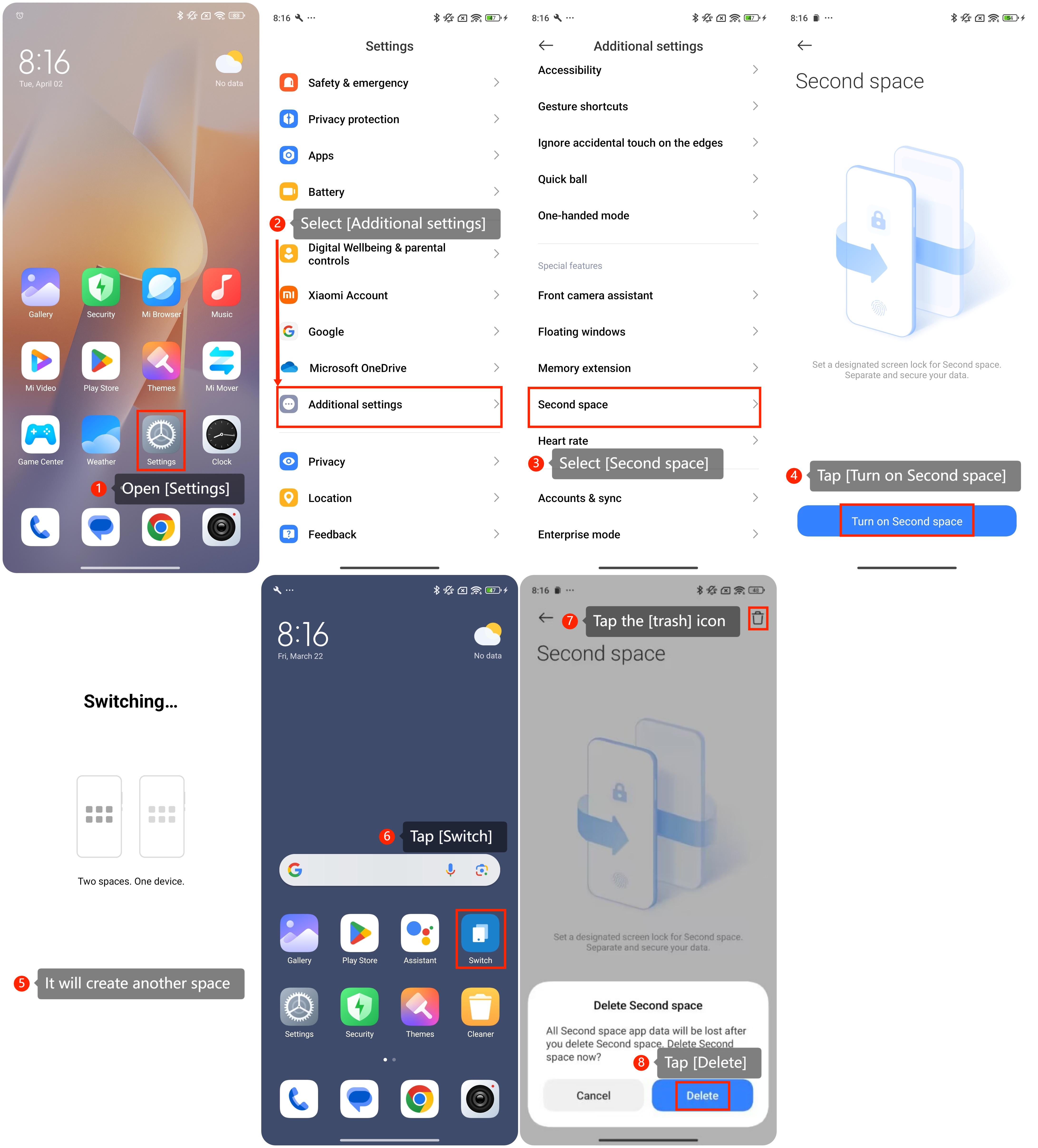 7. To delete the [Second space], please follow the first three steps, and then tap the [trash] icon;