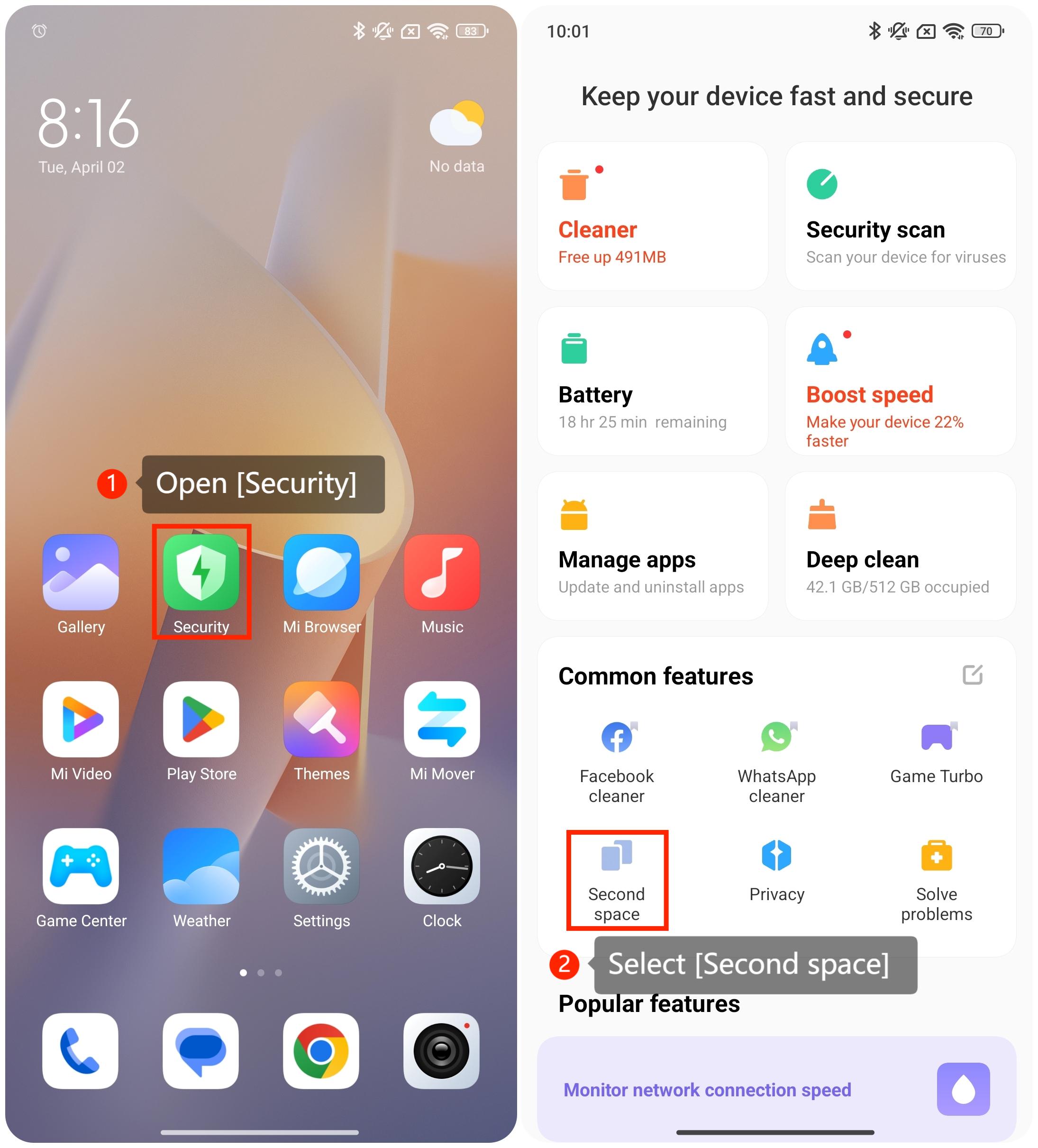 To manage the Second space on the Redmi Note 13 Pro 5G with Xiaomi HyperOS, please refer to the following steps: