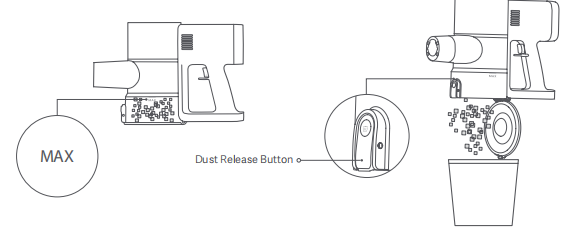 A: Before emptying the dust, please remove the Extension rod and the accessory nozzle, align the Dust Compartment cover end with the trash can and press the Dust Release Button.