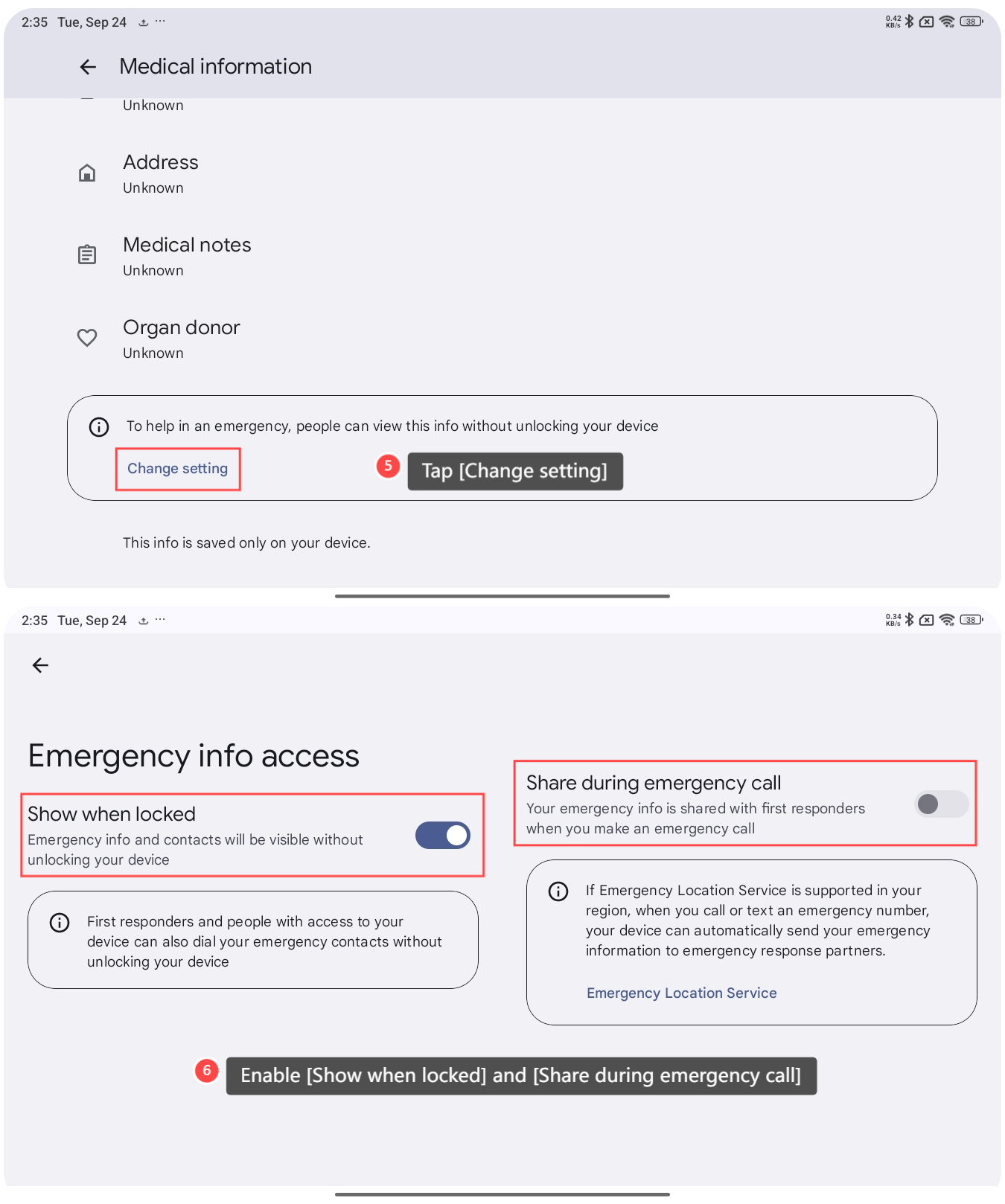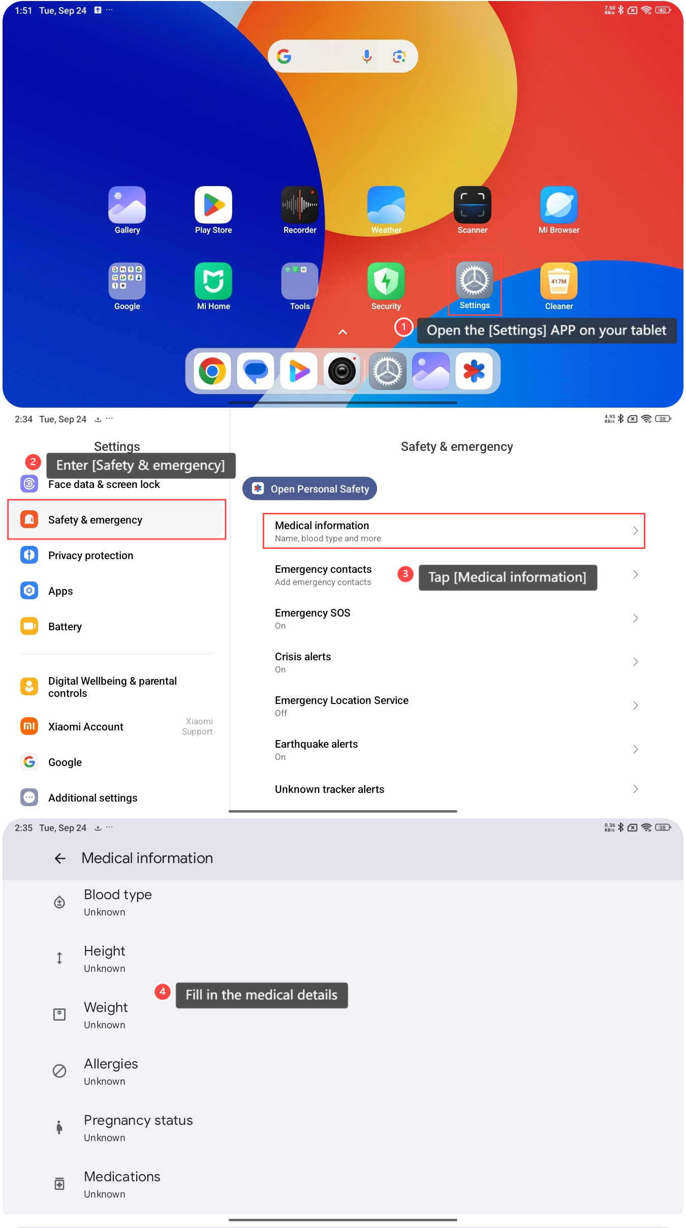 Filling in medical information on the Redmi Pad SE 8.7 4G ensures that critical health details, such as allergies, medical conditions, and emergency contacts, are readily available to first responders. This enhances safety in emergencies, providing quick access to vital information even if the device is locked. To fill in medical information on the tablet, please refer to the following steps: 1. Open the [Settings] APP on your tablet; 2. Enter [Safety & emergency]; 3. Tap [Medical information]; 4. Fill in the medical details, such as [Medications], [Blood type], [Allergies] and so on; 5. Tap [Change setting]; 6. Enable [Show when locked] and [Share during emergency call], allowing emergency information and contacts to be viewed without unlocking your tablet or shared with first responders when you make an emergency call.