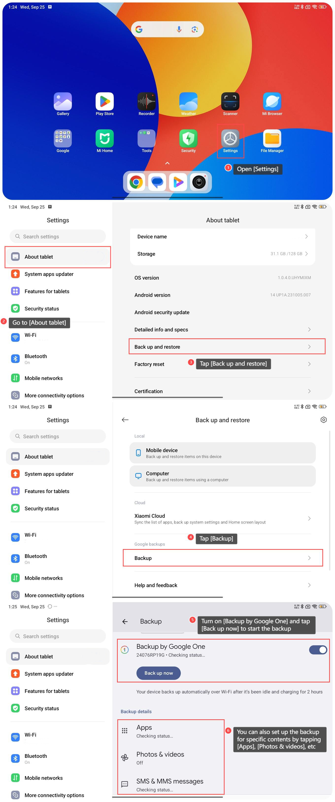 Method 3: 1. Open [Settings] on your tablet; 2. Go to [About tablet]; 3. Tap [Back up and restore]; 4. Tap [Backup]; 5. Turn on [Backup by Google One] and tap [Back up now] to start the backup; Note: Your device backs up automatically over Wi-Fi after it’s been idle and charging for 2 hours. 6. You can also set up the backup for specific contents by tapping [Apps], [Photos & videos], etc.