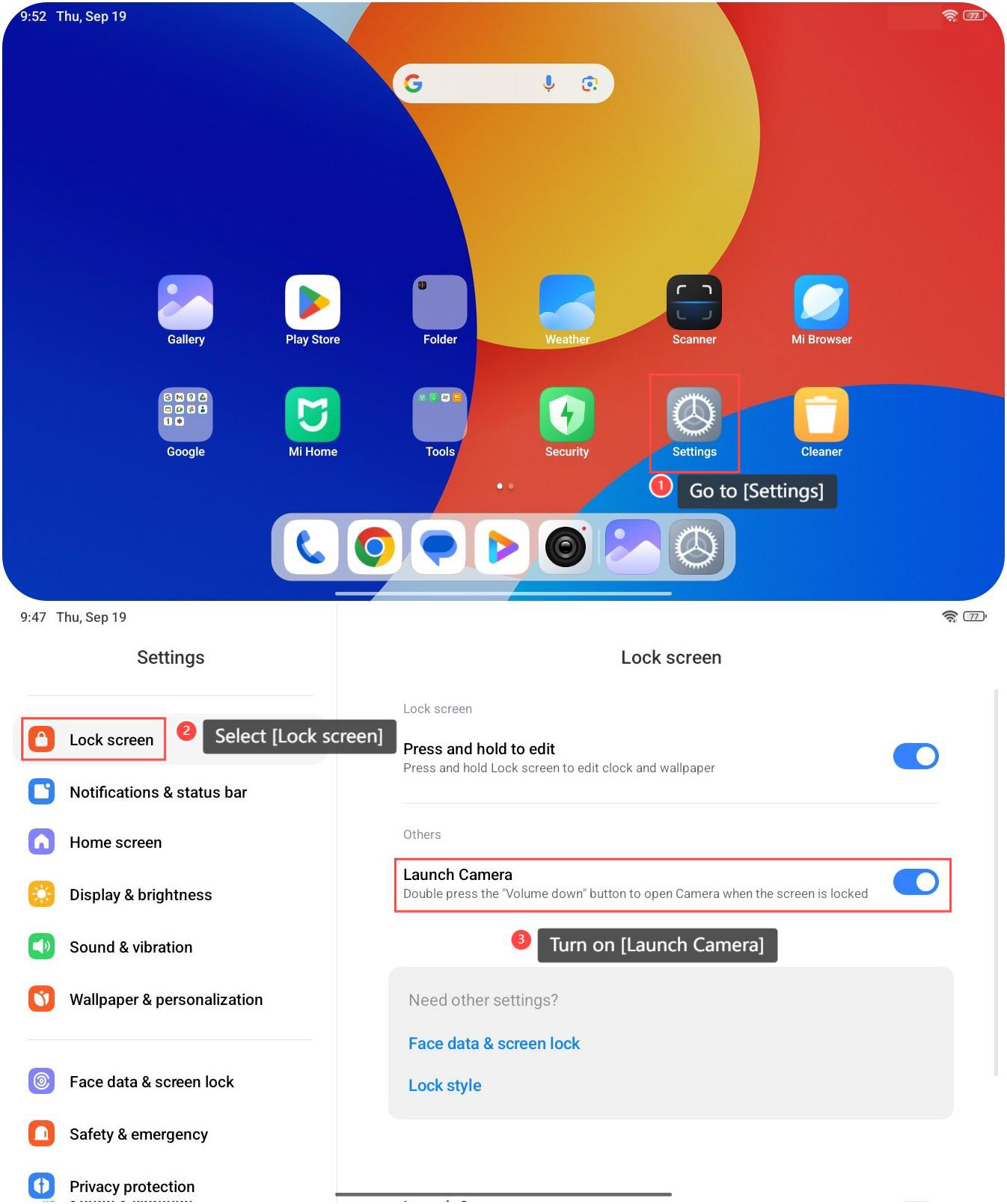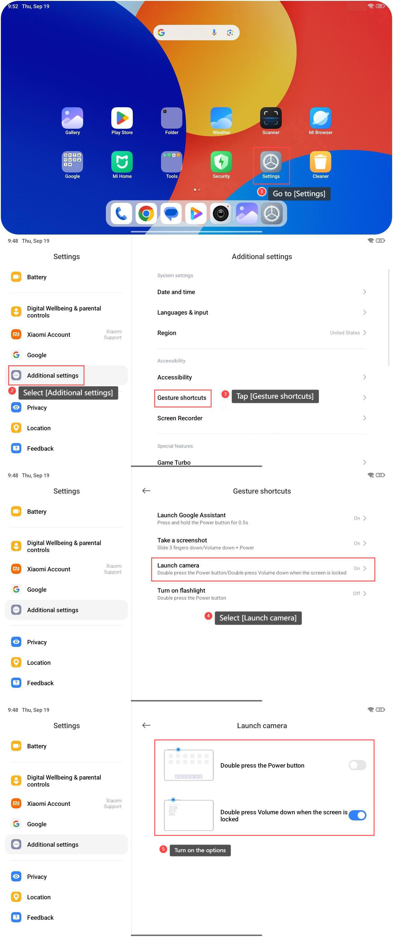 The Redmi Pad SE 8.7 4G features the Launch Camera function, allowing you to quickly open the Camera APP when the screen is locked. After enabling this feature, it will provide a convenient and speedy way to access the camera without having to unlock the tablet or navigate through applications, so that you can capture the important moment swiftly. To enable Launch Camera on your tablet, please refer to the following methods: Method 1: 1. Go to [Settings] on your tablet; 2. Scroll down and select [Lock screen]; 3. Turn on [Launch Camera]. Then you can press the “Volume down” button twice to open Camera when the screen is locked. Method 2: 1. Go to [Settings] on your tablet; 2. Scroll down and select [Additional settings]; 3. Tap [Gesture shortcuts]; 4. Select [Launch camera]; 5. Turn on the options. Then you can press the “Volume down” button twice to open Camera when the screen is locked. And you can also open Camera by pressing the Power button twice.