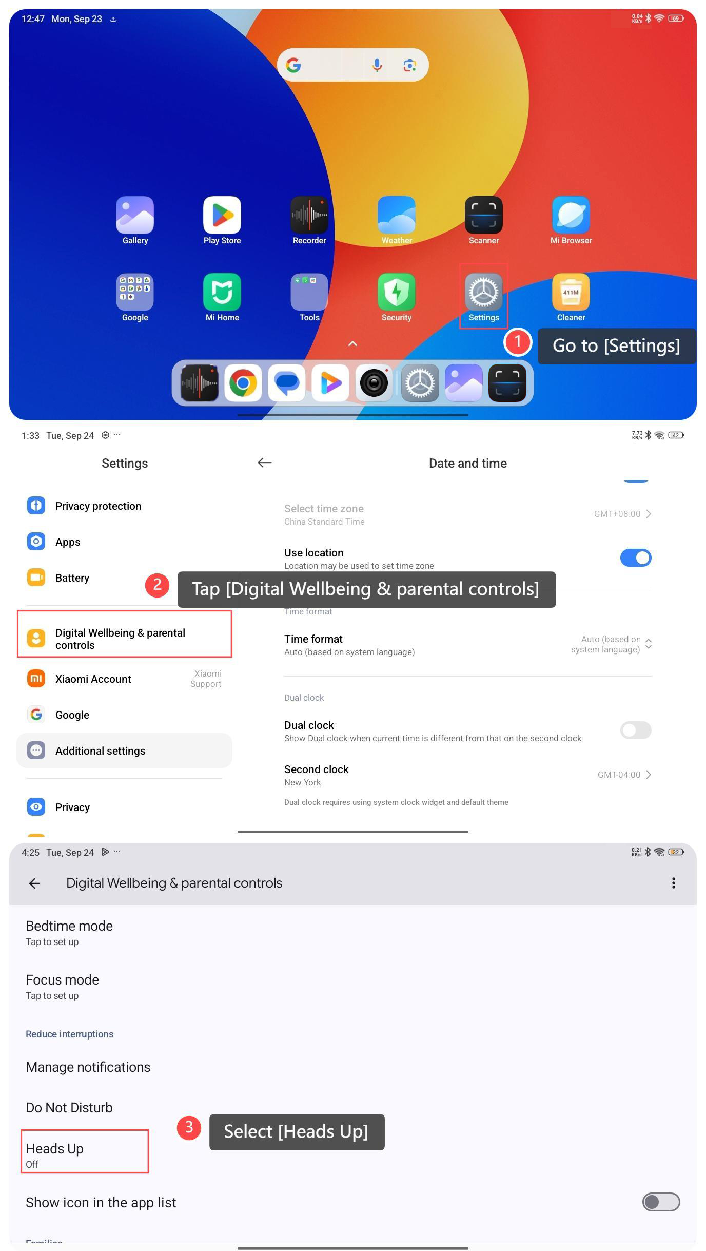 The Redmi Pad SE 8.7features Heads Up. If you are used to using your tablet while you are walking, you will not pay attention to the traffic conditions. When the feature detects this situation, it sends a notification to you, reminding you to be cautious while walking with your tablet. To set up a reminder for watching the road on your tablet, please refer to the following steps: 1. Go to [Settings] on your tablet; 2. Tap [Digital Wellbeing & parental controls]; 3. Scroll down and select [Heads Up];