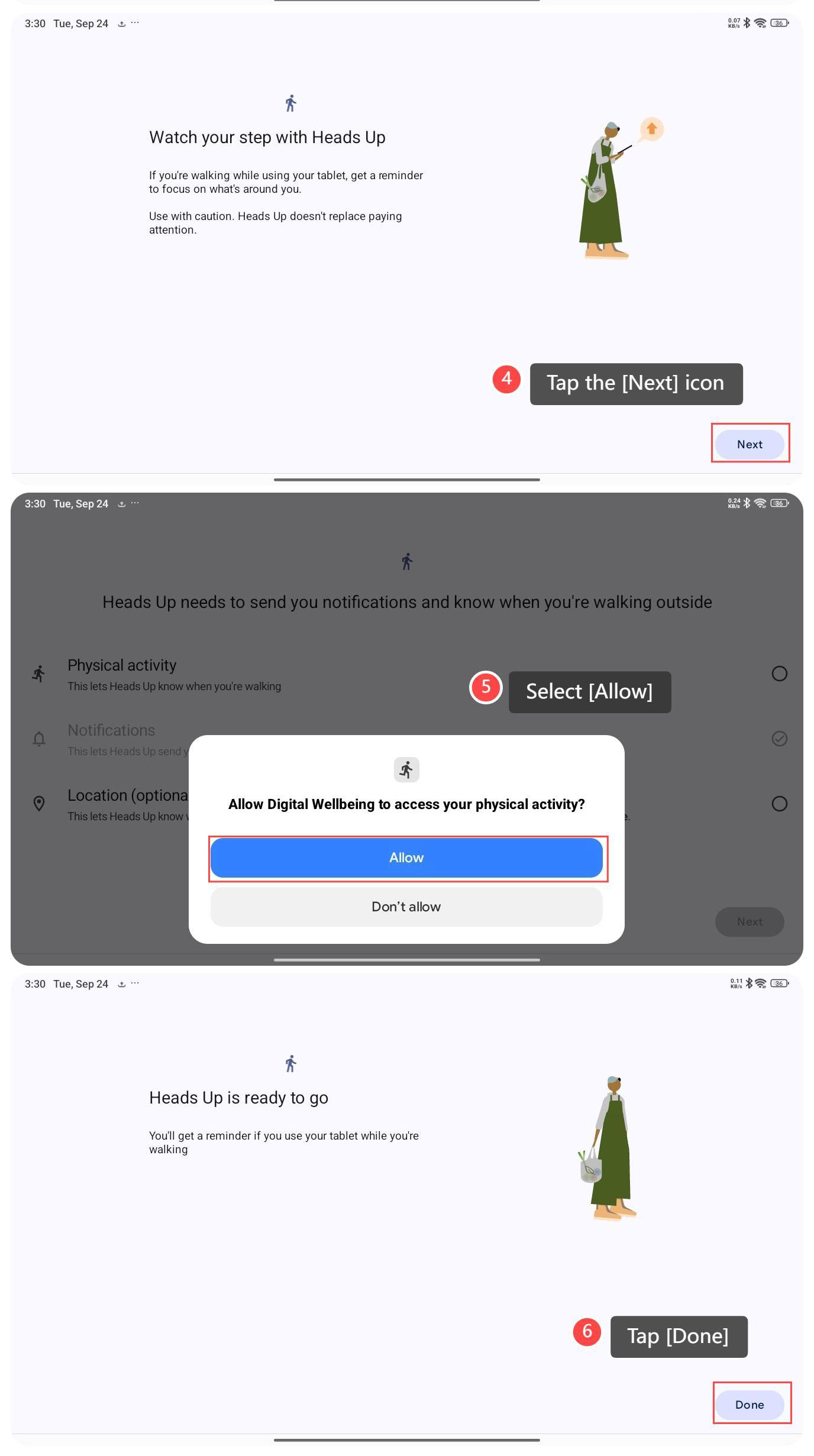 4.Tapthe [Next] icon; 5. The message will appear on the screen prompting you to allow Heads Up to send you notifications and know when you’re walking outside. Please select [Allow]; 6.Tap [Done]. You have enabled Heads Up by now and you will get a reminder if you use your tablet while you are walking.