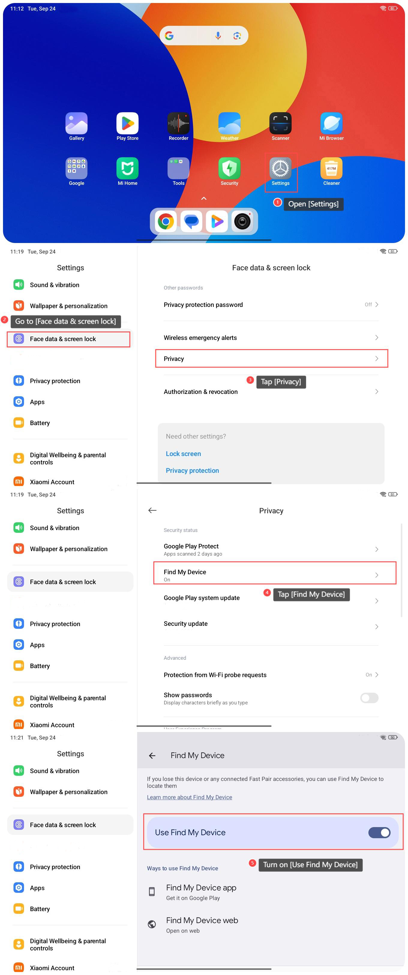 Find My Device is a feature on the Redmi Pad SE 8.7 that helps you locate your tablet if it's lost or stolen. By using your Google account, you can track the device's location on a map, remotely ring it, lock it, or even erase its data to protect your privacy. To use this feature, you'll need to ensure that location services and Find My Device are enabled in the settings. To use Find My Device on the Redmi Pad SE 8.7, please refer to the following steps: 1. Open [Settings]; 2. Go to [Face data & screen lock]; 3. Tap [Privacy]; 4. Tap [Find My Device]; 5. Turn on [Use Find My Device]. Note: After opening, you can find your device through the web page or the application.