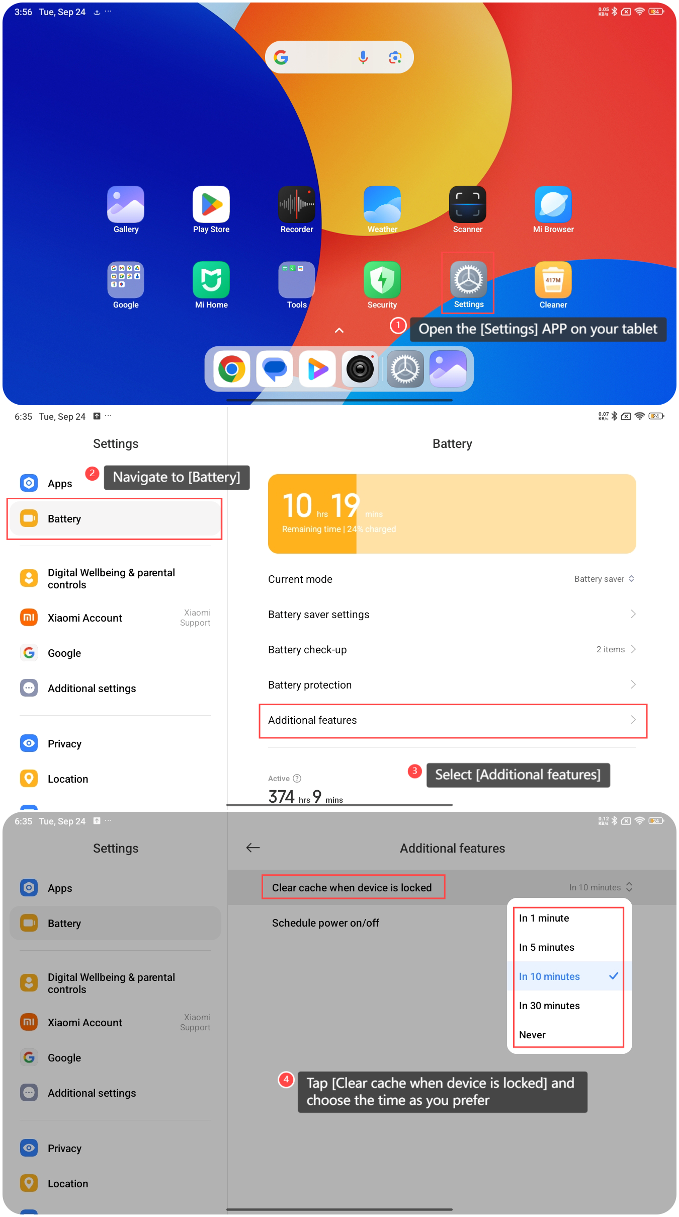 Clearing cache when the Redmi Pad SE 8.7 4G is locked helps free up storage space, improve performance, and enhance security. It ensures that temporary files do not accumulate, which can slow down the system or lead to potential data privacy issues. To clear cache when the Redmi Pad SE 8.7 4G is locked, please refer to the following steps: 1. Open the [Settings] APP on your tablet; 2. Navigate to [Battery]; 3. Select [Additional features]; 4. Tap [Clear cache when device is locked] and choose the time as you prefer. Note: 1. This feature can consume less power during operation, which can improve overall battery life during usage; 2. It is advisable to regularly clear the cache for optimal performance.