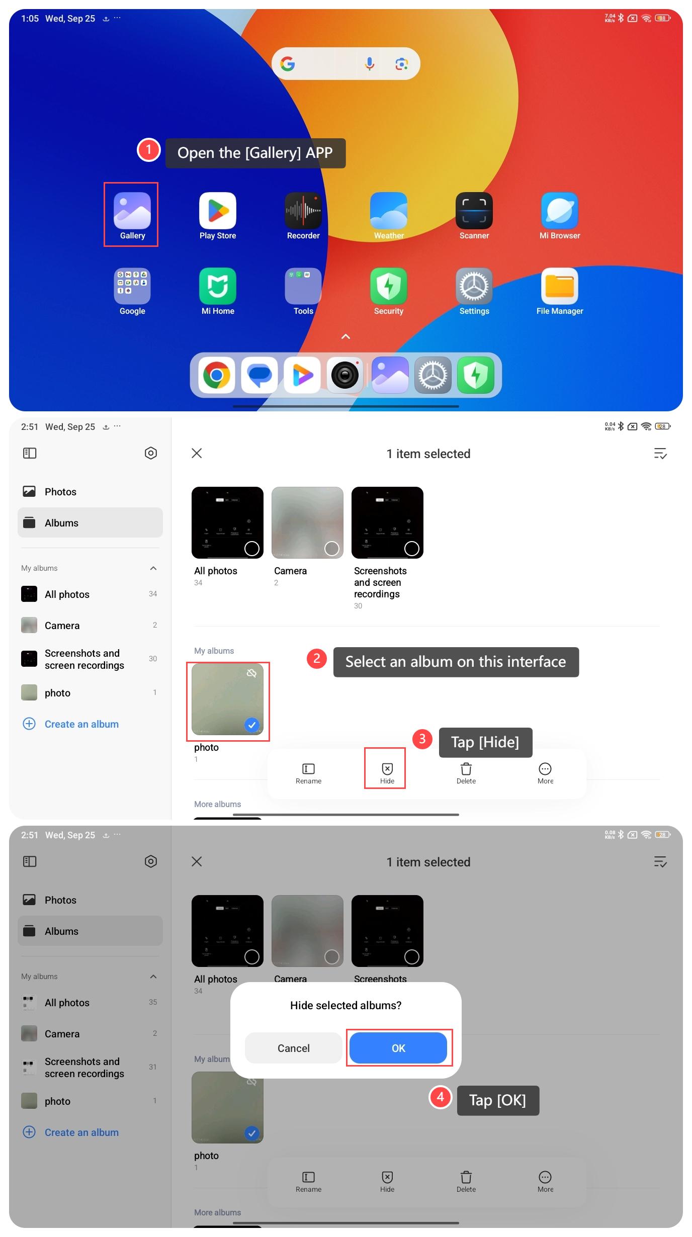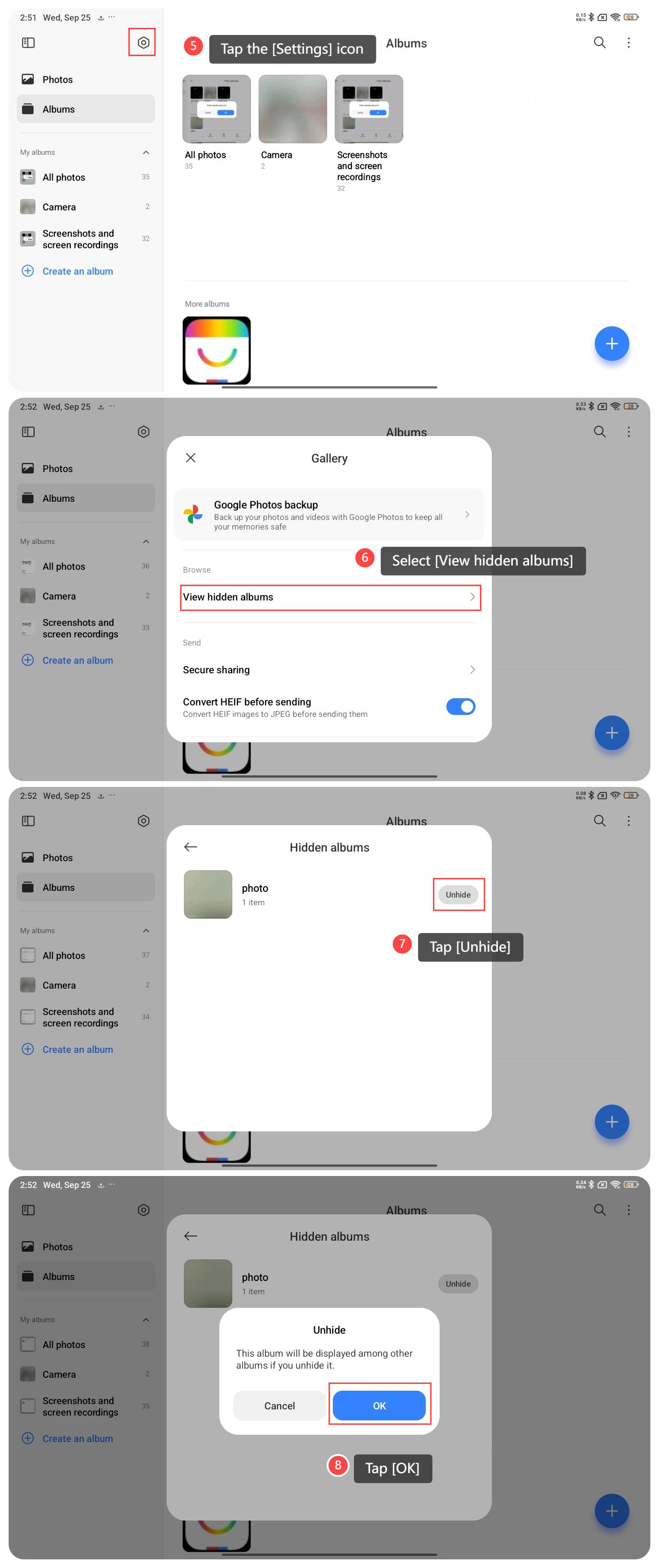 The function of hiding or unhiding an album in the Gallery on the Redmi Pad SE 8.7 4G allows you to control the visibility of specific photo albums.Hiding an album protects sensitive photos by keeping them out of the main Gallery view, while still allowing access through settings. It helps declutter the Gallery for easier management, and you can unhide albums anytime to quickly restore their visibility. To hide/unhide an album in Gallery on your tablet, please refer to the following steps: 1. Open the[Gallery]APP; 2. Select an album on this interface; 3. Tap [Hide]; 4. Tap [OK]. The album will be hidden; 5. Tap the [Settings] icon; 6. Select [View hidden albums]; 7. Tap [Unhide]; 8. Tap [OK]. The album will be unhidden.