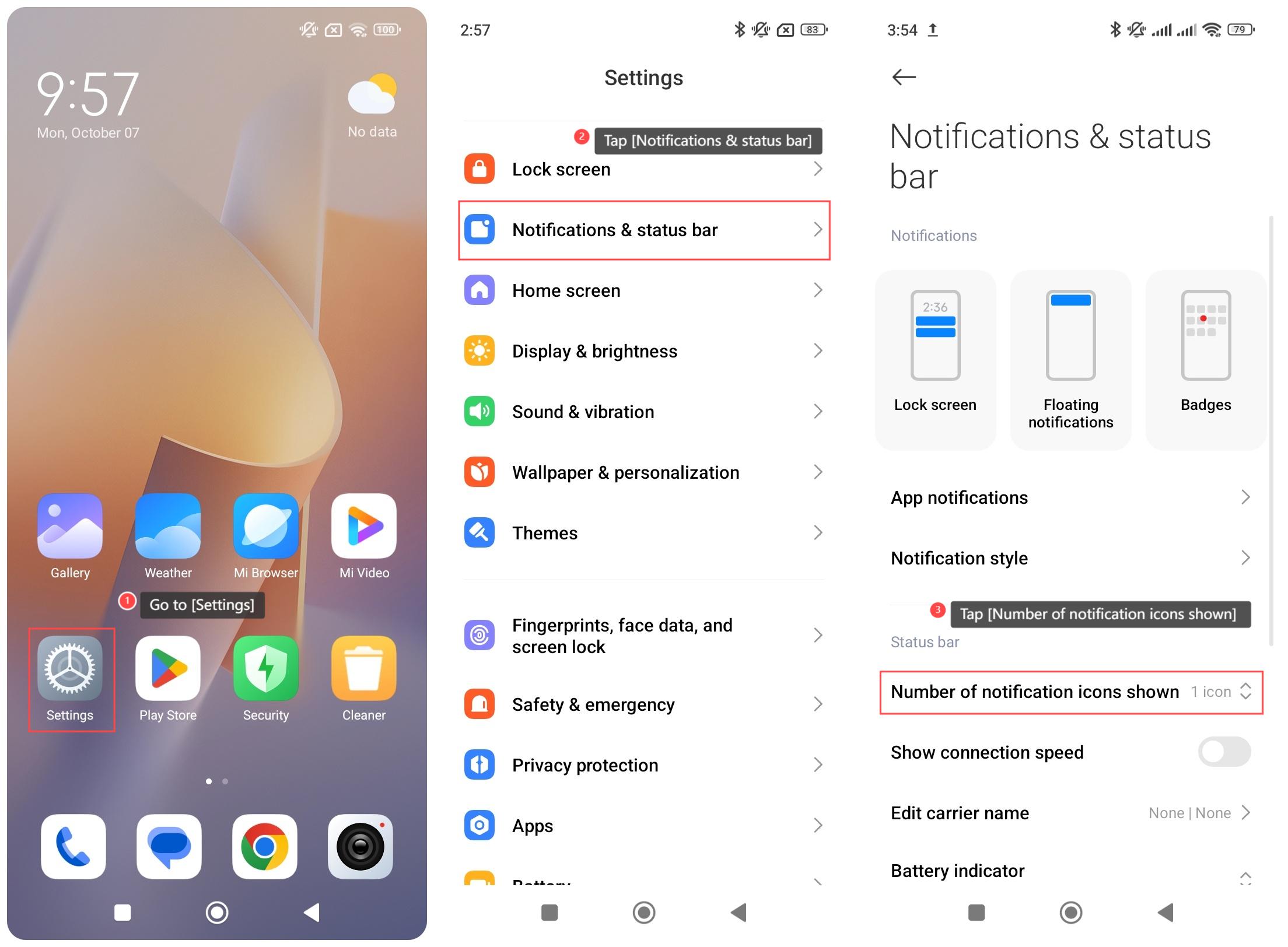 Setting the number of notification icons in the status bar on the Redmi 13C helps reduce clutter, making the bar less crowded and easier to navigate. It enhances focus by showing only essential notifications, improves accessibility, and allows for a more personalized usage experience. To manage the number of notification icons shown on your phone, please refer to the following steps: 1. Go to [Settings]; 2. Tap [Notifications & status bar]; 3. Tap [Number of notification icons shown] and select from the options according to your needs. Note: After the settings are completed, you can check the status bar to see if the number of icons displayed matches your selection.