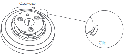 To install the Xiaomi Smart Ceiling Light D30, please refer to the following details: 1. Drilling holes: (1) Open the package to take out this light and the accessories pack; (2) Rotate this light counterclockwise to detach the chassis. Utilize an impact drill provided with a 6mm diameter bit to drill holes of ≥ 30mm depth in the concrete ceiling, and insert the wall plug section of the three expansion screws into these holes; (3) Take out the cross round head self-tapping screws in the accessories pack, screw and tighten three self-tapping screws into the wall plug corresponding to the chassis mounting holes to complete the chassis installation; 2. Wire connections: (1) Please make sure to cut off the power before proceeding with the following connection operations; (2) Cut off any excess inlet wires from the ceiling, ensuring that the wires are positioned closely to the ceiling. Proceed to securely and correctly connect the reserved wires of the light body with those of ceiling. The black reserved wire is the live wire, while the white one is the neutral wire; 3. Installing the tight: Align the notch with the clip position protruding from the chassis, and rotate this light clockwise in the direction clockwise in the direction as shown in the diagram until it snaps into place to complete the installation.