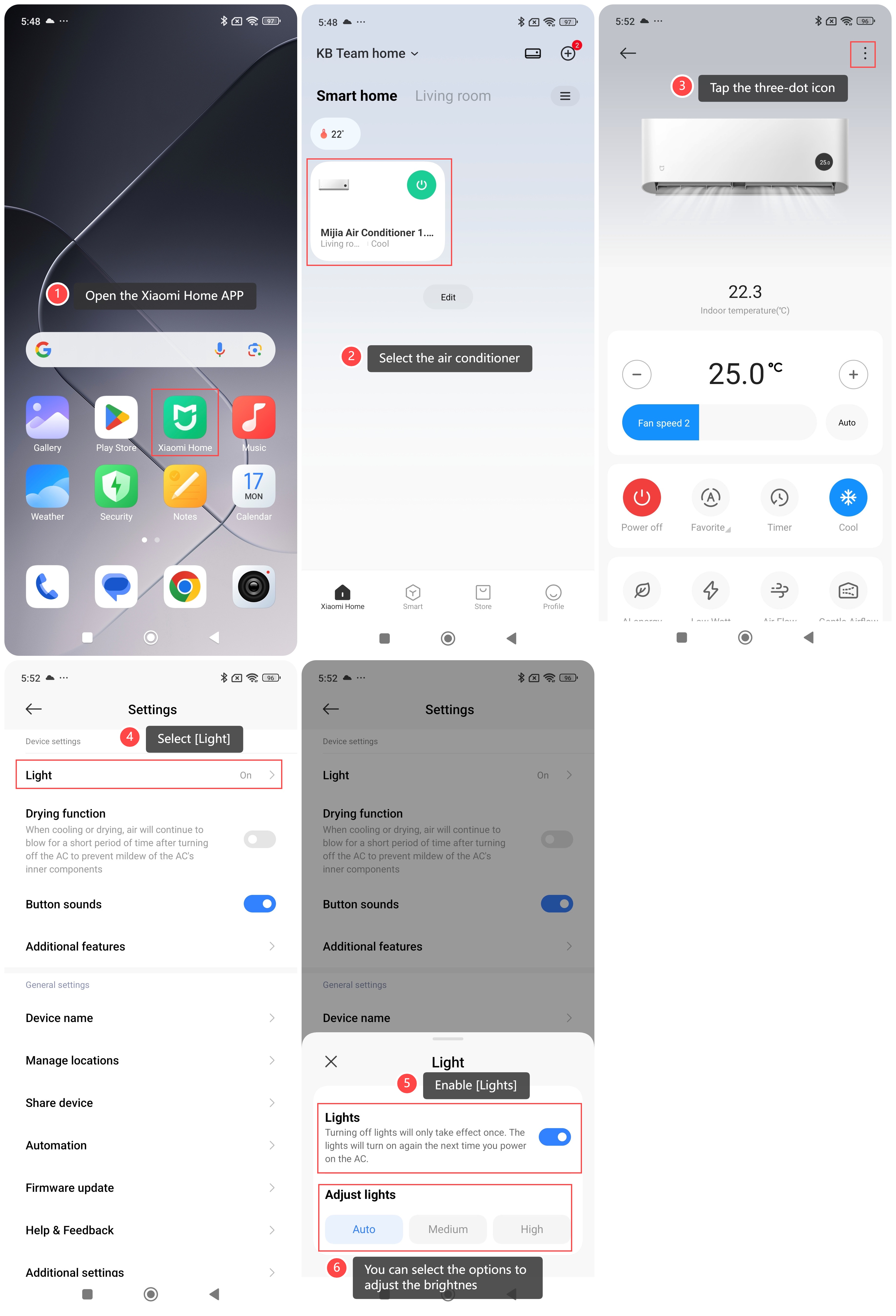 The Mijia Air Conditioner Pro Eco LABEL EGAT NO.5 (3 Star) 12000BTU Inverter offers the option to adjust the screen brightness for better visibility or to reduce light disturbance, especially at night, ensuring that the display is visible during the day while providing a softer, less distracting glow in low-light environments. To adjust the screen brightness of the air conditioner, please refer to the following steps: 1. Open the Xiaomi Home APP; 2. Select the air conditioner; 3. Tap the three-doticon; 4. Select [Light]; 5. Enable [Lights]; 6. You can select the options: [Auto], [Medium] or [High] to adjust the brightness. Note: Before adjusting the brightness, you can also turn the display of the indoor unit on by pressing the light button on the remote control.