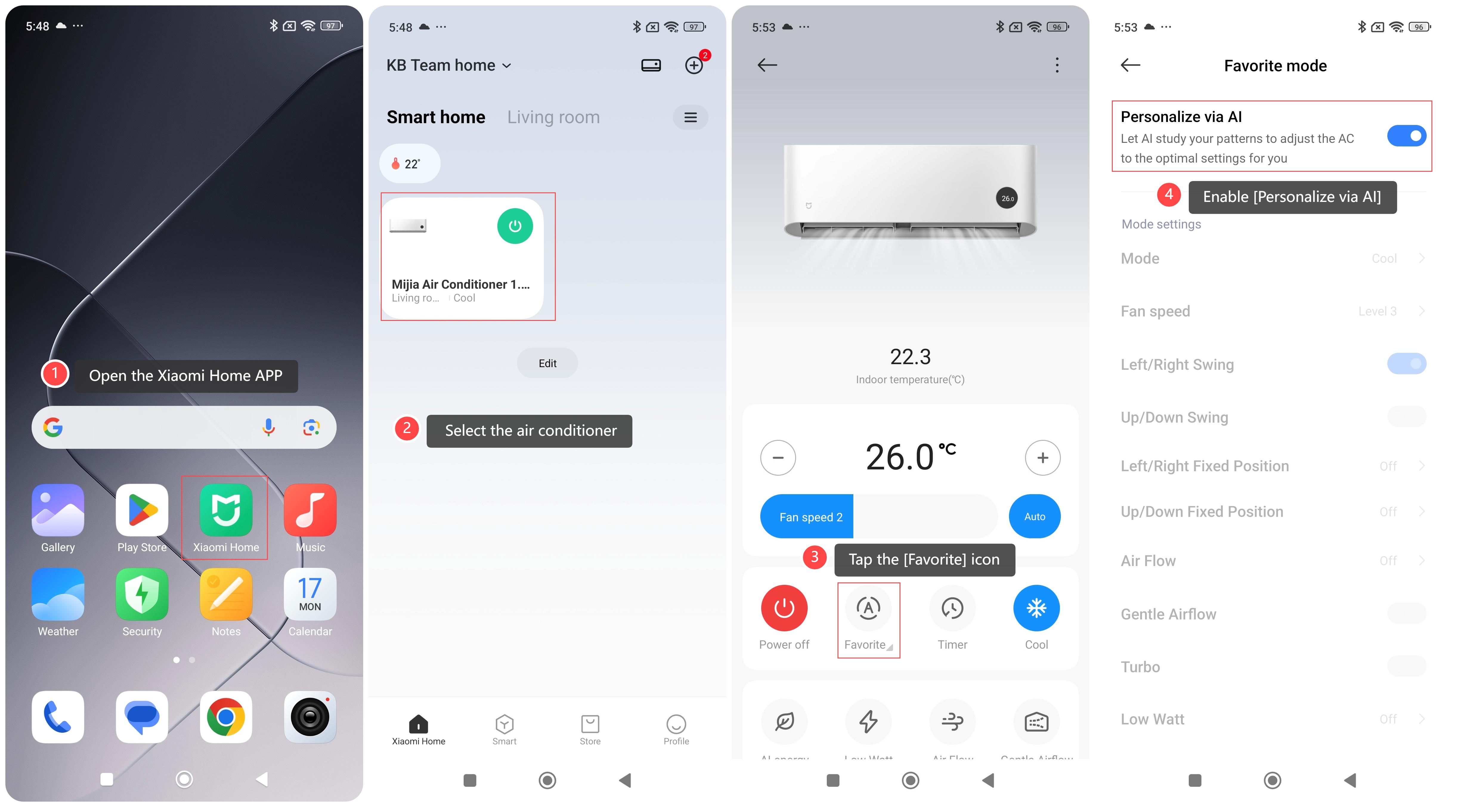 The favorite mode on the Mijia Air Conditioner Pro Eco 5-Star 1.5 HP Inverter is a personalized feature that leverages AI to study your usage patterns and preferences. By automatically adapting to your needs, the favorite mode ensures a hassle-free experience, providing optimal comfort while minimizing the need for manual adjustments. To customize the favorite mode on the air conditioner, please refer to the following steps: 1. Open the Xiaomi Home APP; 2. Select the air conditioner; 3. Tap the [Favorite]icon; 4. Enable [Personalize via AI].