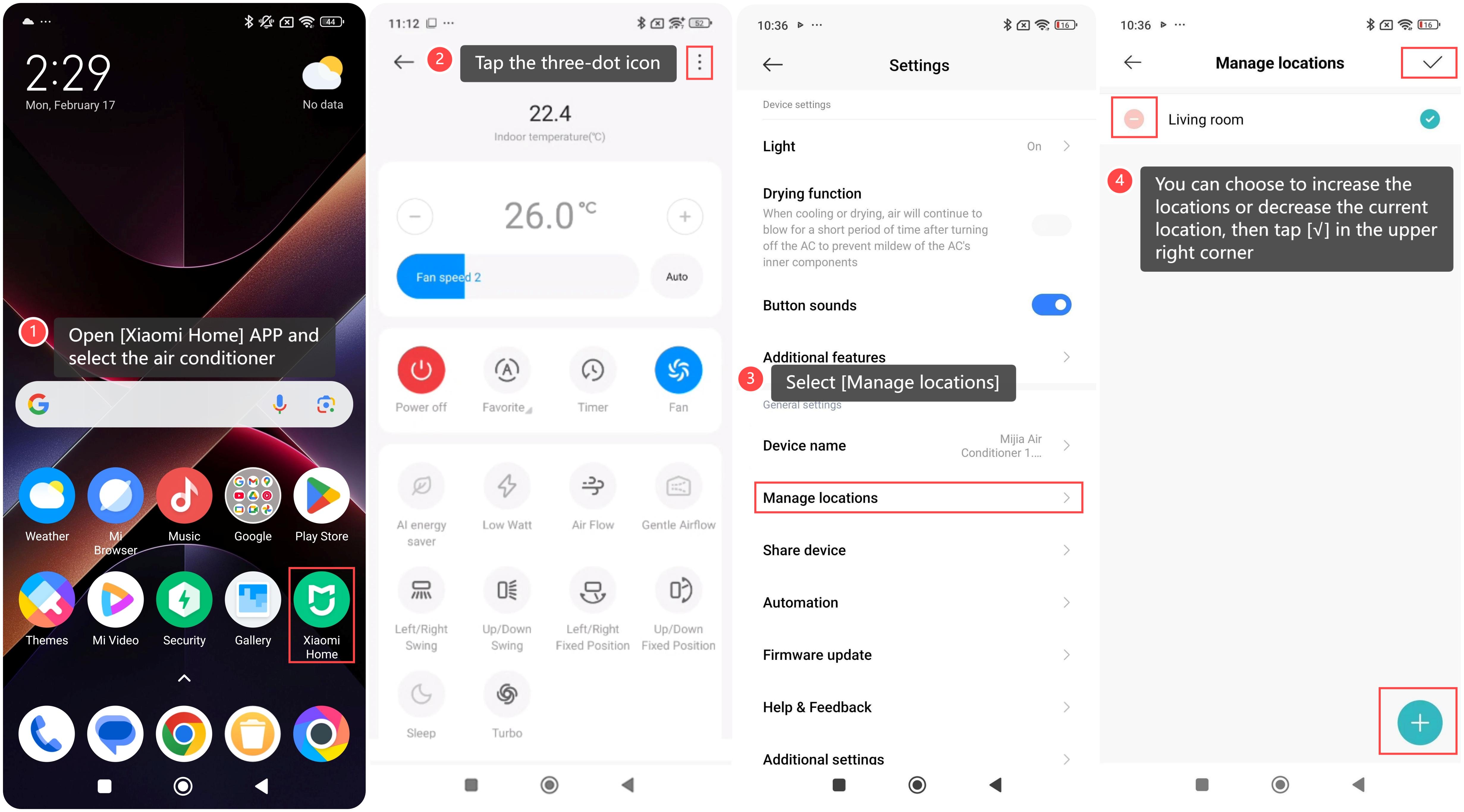 The Mijia Air Conditioner Pro Eco LABEL EGAT NO.5 (3 Star) 12000BTU Inverter supports managing the location in the Xiaomi Home APP. If you have more than one Xiaomi air conditioner in different rooms or areas, the Xiaomi Home APP lets you manage multiple locations at once, allowing you to control all of your devices with ease. By using the Xiaomi Home APP to manage the location of your air conditioner, you can enhance the convenience, efficiency, and comfort of your space. To manage the locationin the Xiaomi Home APP, please refer to the following steps: 1. Open [Xiaomi Home] APP and select the air conditioner; 2. Tap the three-dot icon at the upper right corner; 3. Select [Manage locations]; 4. You can choose to increase the locations or decrease the current location, then tap [√] in the upper right corner.