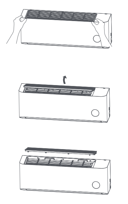 It is recommended to clean the Mijia Air Conditioner Pro Eco 5-Star 1.0 HP Inverter every three months. Once the air conditioner is connected to the network, the system will automatically send a cleaning notification. If you receive a push notification, please follow these steps to clean the filter: 1. As shown in the figure, open the clips at both ends and the middle of the filter, and pull upward to remove the filter; 2. After the filter is removed, use a vacuum cleaner to remove the dust or rinse the filter with clean water; 3. Align the clips with the snapping positions and reinstall the filter correctly. Note: 1. Do not use wire scrubbers or brushes to clean the air filter to avoid damage; 2. Do not wash the unit with water to prevent malfunctions or electric shock hazards; 3. Do not wash the remote control with water to avoid malfunctions; 4. Do not use alcohol, gasoline, lacquer thinner, polishing powder, essential oils, toothpaste, detergent, or other chemical products or solvents to clean the air conditioner, as they will damage the product; 5. As long as the filter is not damaged or deformed, there is no need to replace it.