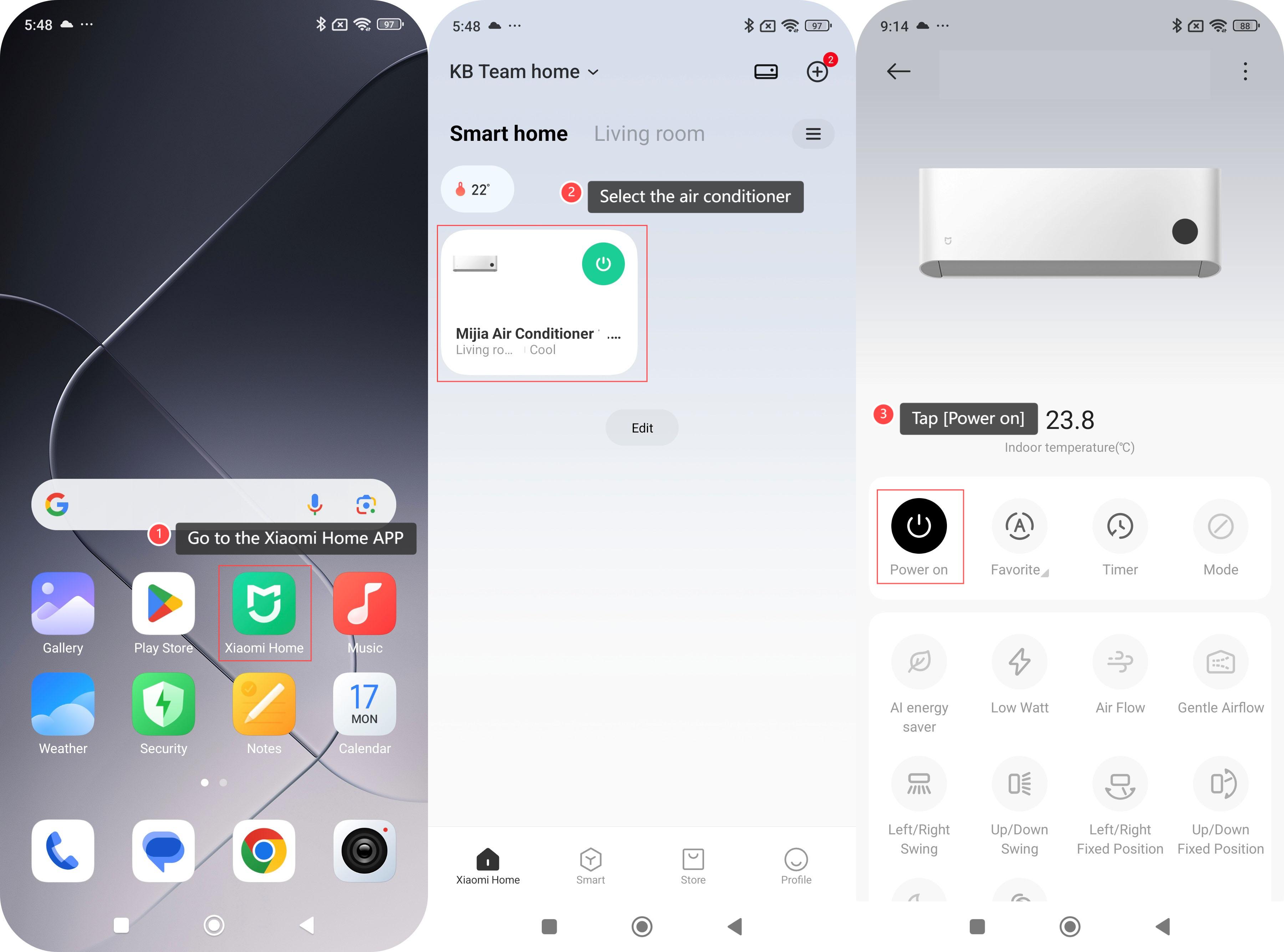 To turn on or turn off the Mijia Air Conditioner Pro Eco LABEL EGAT NO.5 (3 Star) 12000BTU Inverter, you can press the On/Off Button on the remote control. You can also tap the power icon on the air conditioner interface of the Mi Home/Xiaomi Home APP to remotely turn on or turn off the air conditioner, which can help you turn on or turn off the air conditioner without operating on the remote control and save your time and energy. To turn on or turn off the air conditioner on the Mi Home/Xiaomi Home APP, please refer to the following steps: 1. Go to the Xiaomi Home APP; 2. Select the air conditioner; 3. Tap [Power on] to turn on the air conditioner. Note: In the power-on status, you can also tap [Power off] on the air conditioner interface of the Mi Home/Xiaomi Home APP to turn off the air conditioner.