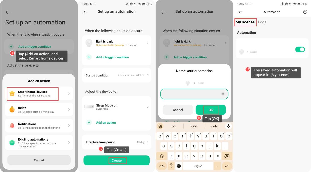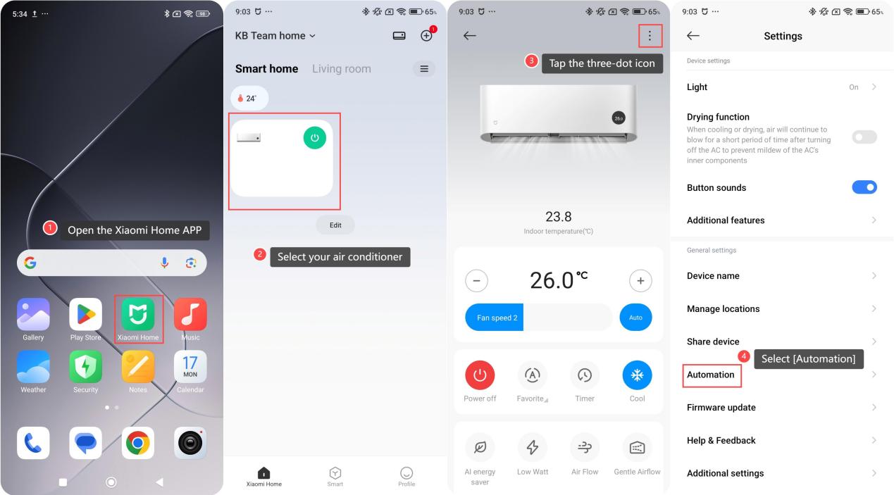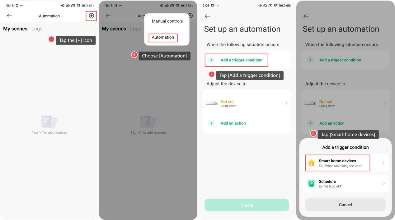 The Mijia Air Conditioner Pro Eco 5-Star 1 PK Inverter supports the Automation function, allowing you to set up automatic triggers and execution commands while linking with other IoT devices. This provides a more energy-efficient, convenient, and automated living experience. For example, the air conditioner can turn on or off automatically based on the current indoor temperature or humidity. To achieve a smart linkage with other devices, please refer to the following steps: 1. Open the Xiaomi Home APP on your phone; 2. Select your air conditioner; 3. Tap the three-dot icon in the upper right corner; 4. Select [Automation]; 5. Tap the [+] icon in the upper right corner; 6. Choose [Automation]; 7. Tap [Add a trigger condition]; 8. Then tap [Smart home devices] to select your air conditioner or other devices as the trigger; 9. Tap [Add an action] and select[Smart home devices] to choose another device as the action; 10. Tap [Create] to save the automation; 11. You can rename your automation and tap [OK] to save; 12. Then, the saved automation will appear in [My scenes]. There is a switch on the right, allowing you to easily turn it on or off for better management of your smart scenes.