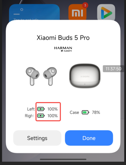 A: The Xiaomi pop-up windows of the Xiaomi Buds 5 Pro display the current battery level of the earbuds and charging case, charging status, and quick connection.