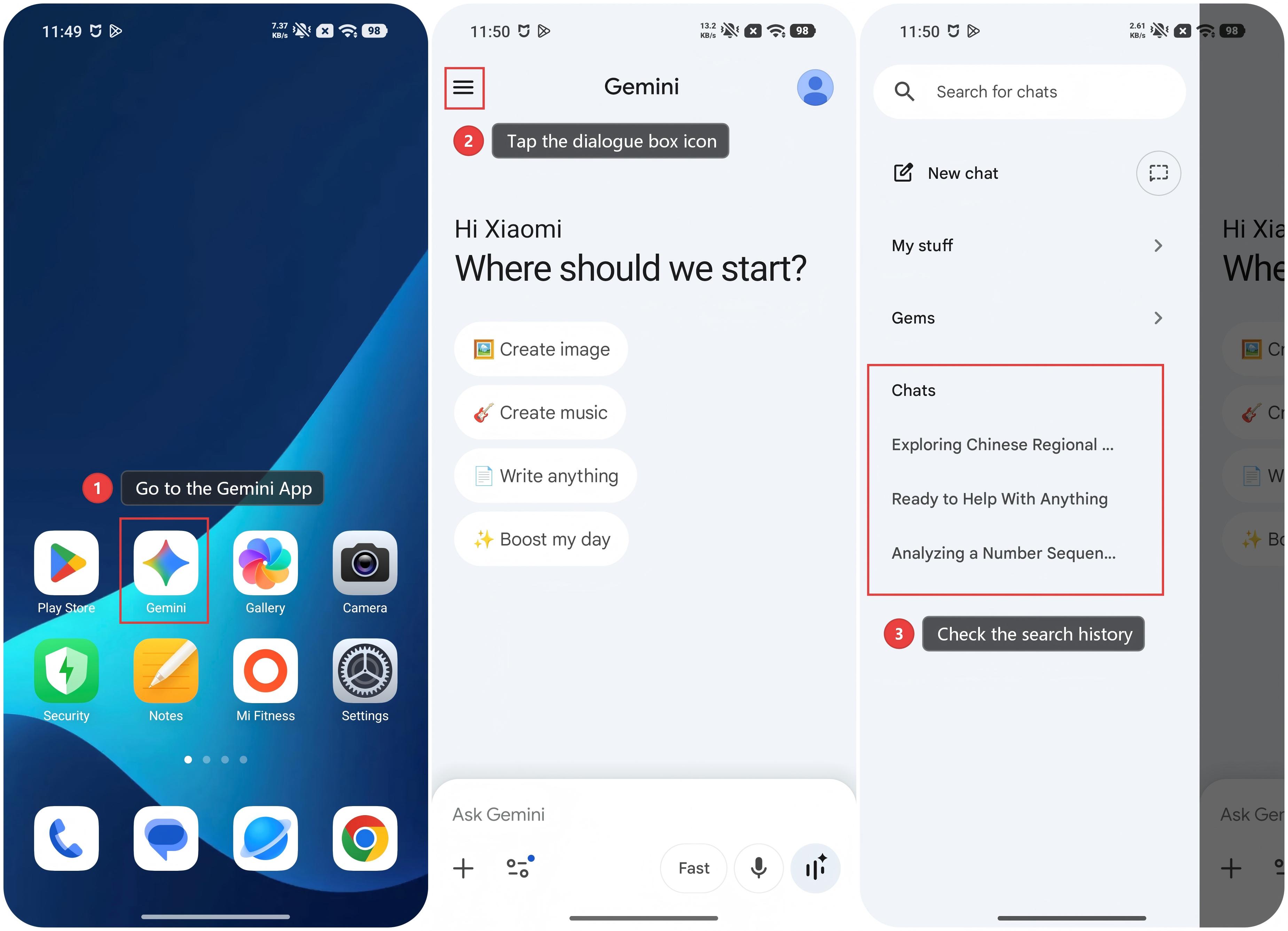 Gemini is an AI assistant that can answer your questions, generate text, summarize texts, translate languages, and write emails, essays, and code. After you chat with Gemini, the chats will be saved. Recent chats will appear in the Gemini App, so you can pin, rename, and continue them.