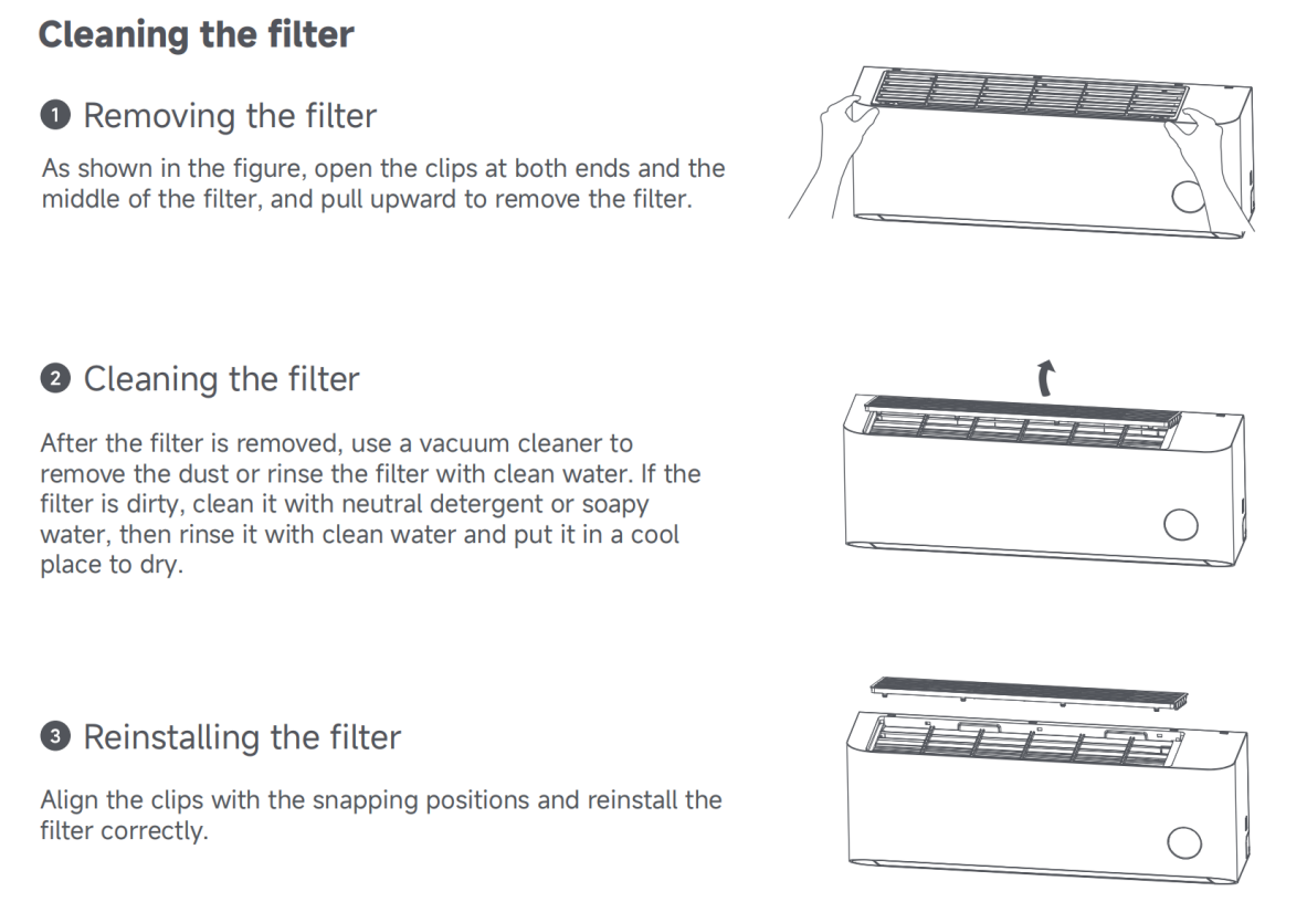 The Mijia Air Conditioner Pro Eco Inverter 1.0 HP does not have a filter element. Instead, it comes equipped with a built-in washable filter, which is designed to be durable, long-lasting, and resistant to damage under normal use. To help maintain optimal performance, the Xiaomi Home App offers filter clogging alerts, reminding you when it’s time to clean the filter. Regular cleaning ensures efficient airflow, better cooling, and improved air quality. To clean the filter of the Mijia Air Conditioner Pro Eco Inverter 1.0 HP, please refer to the following steps: 1. To remove the filter, open the clips at both ends and the middle of the filter, and pull upward to remove the filter; 2. After the filter is removed, use a vacuum cleaner to remove the dust or rinse the filter with clean water. If the filter is dirty, clean it with neutral detergent or soapy water, then rinse it with clean water and put it in a cool place to dry; 3. To reinstall the filter, align the clips with the snapping positions and reinstall the filter correctly. Note: The air conditioner adopts an integrated top-mounted filter design to simplify product development and meet the need for top air intake and dust blocking.