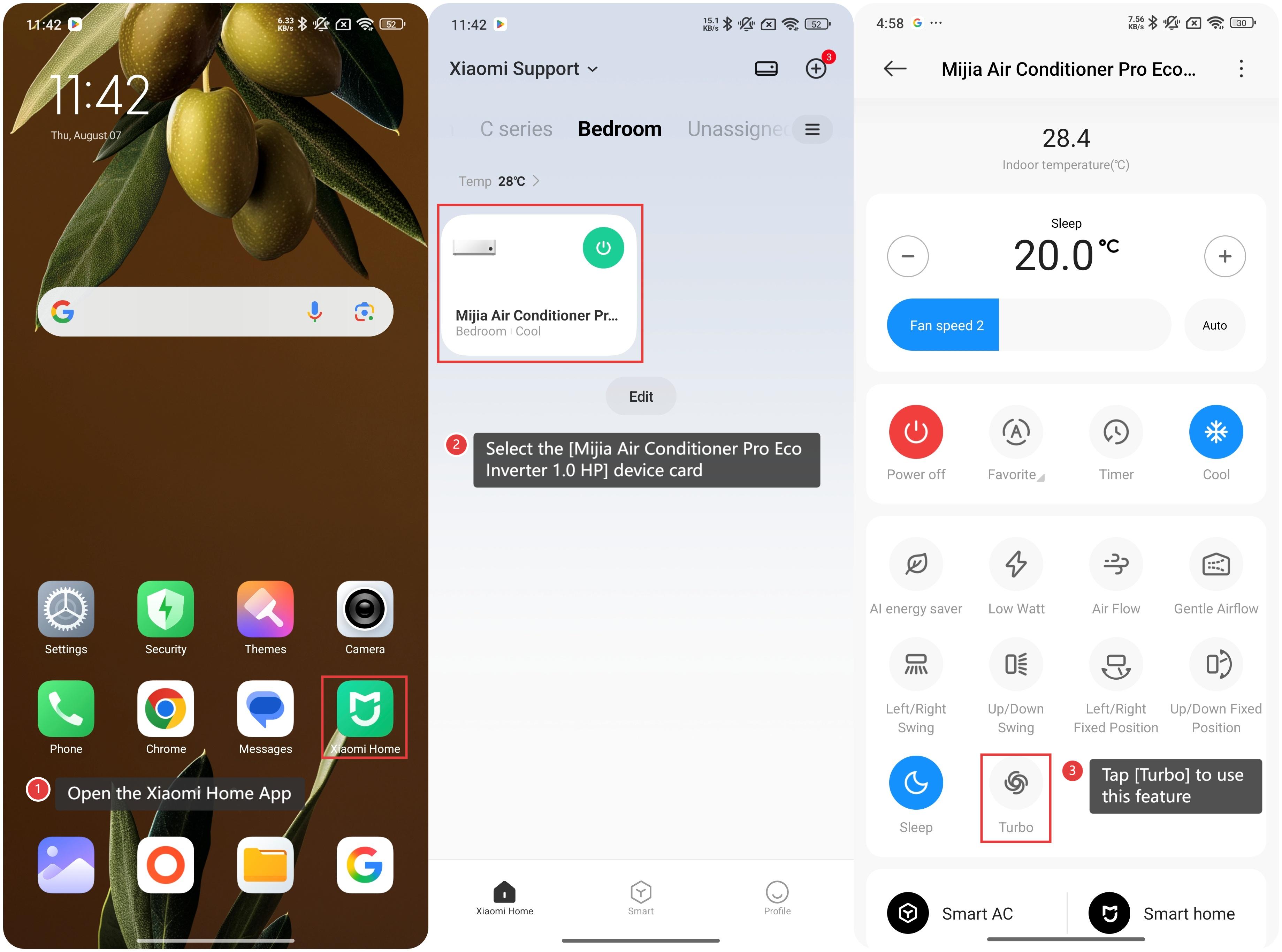 Turbo mode instantly boosts the Mijia Air Conditioner Pro Eco Inverter 1.0 HP’s cooling capacity to its maximum to achieve rapid cooling. Once Turbo mode is activated, the system increases the operating frequency and speed of components such as the compressor and fan to their highest levels, allowing the air conditioner to cool the room as quickly as possible. To use the Turbo mode on the air conditioner, please refer to the following methods: Method 1: Once the air conditioner is powered on and operating normally, you can press the [Turbo] button on the remote control to enable or disable Turbo mode. Method 2: 1. Open the Xiaomi Home App on your device; 2. Select the [Mijia Air Conditioner Pro Eco Inverter 1.0 HP] device card; 3. Tap [Turbo] to use this feature.