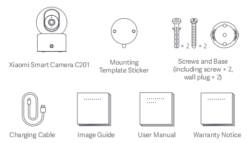 The Xiaomi Smart Camera C201 × 1, Mounting Template Sticker × 1, Screws and Base (Including screw × 2, wall plug × 2), Charging Cable × 1, Image Guide × 1, User Manual × 1, and Warranty Notice × 1.