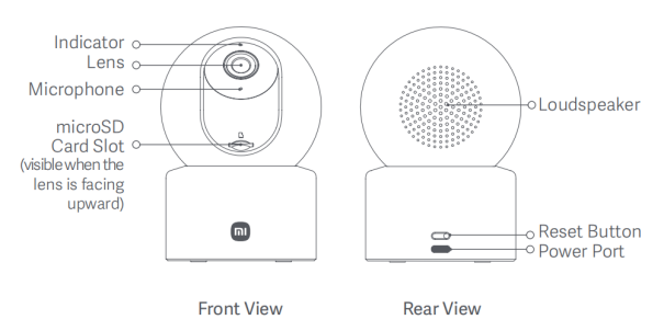 Front View: Indicator, Lens, Microphone, microSD Card Slot (It is visible when the lens is facing upwards).