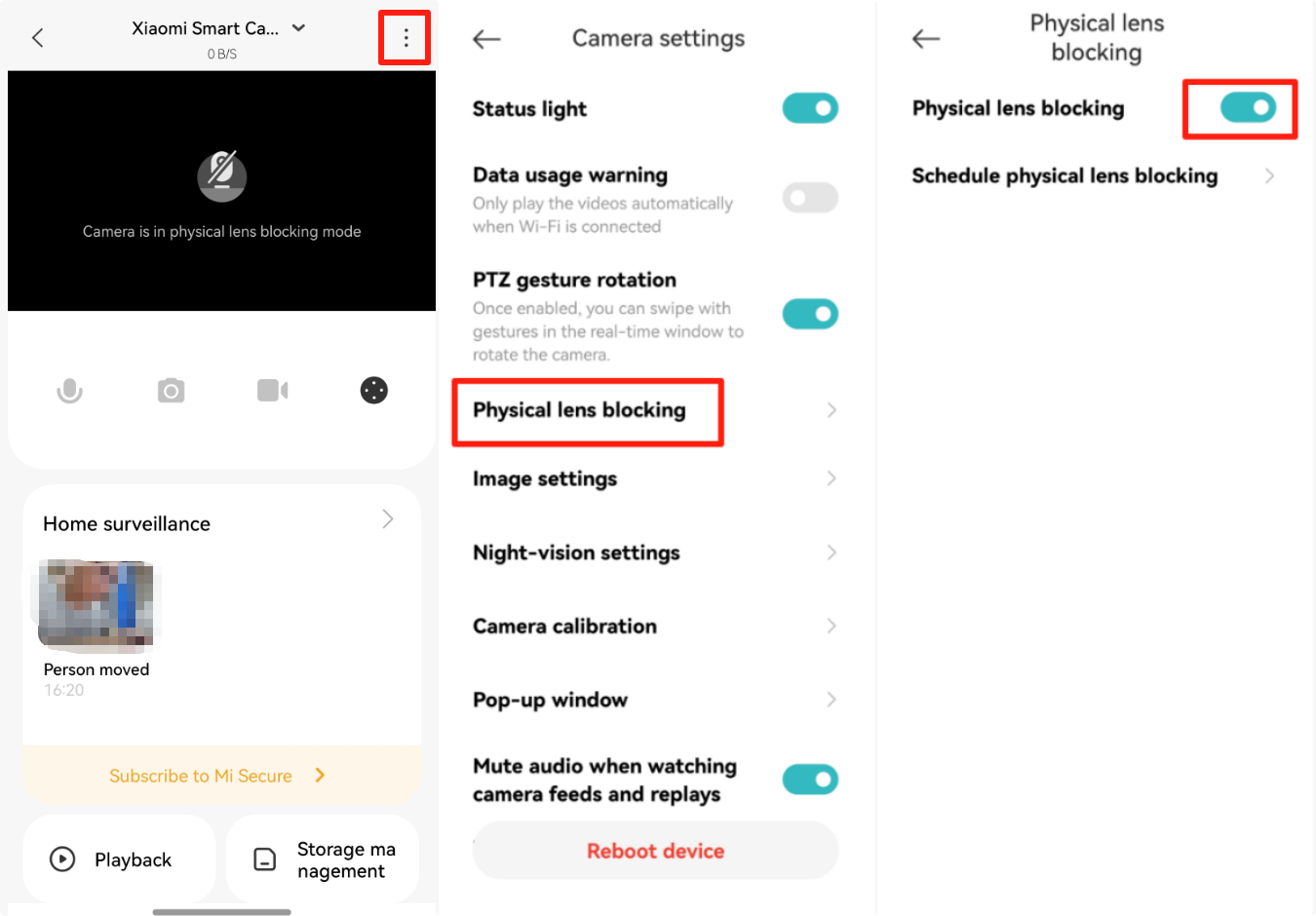 Open Xiaomi Home App >> [Device card] >> tap the three-dot icon at the upper right corner >> [Camera settings] >> select [Physical lens blocking] >> you can choose [Physical lens blocking] or set the time of Physical lens blocking by tapping [Schedule physical lens blocking].