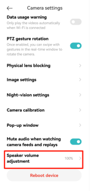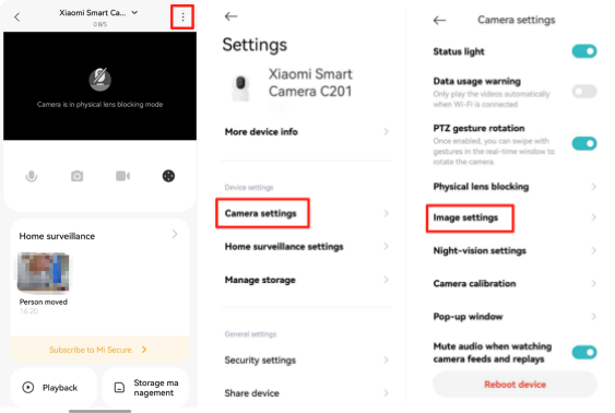 Open Xiaomi Home App >> select [Device card] >> tap the three-dot icon at the upper right corner >> [Camera settings] >> [Reboot device].
