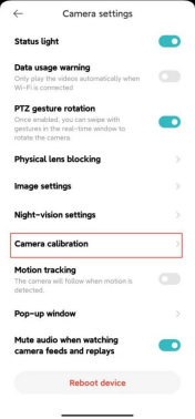 Open Xiaomi Home App >> select [Device card] >> tap the three-dot icon at the upper right corner >> [Camera settings] >> select [Camera calibration] >> wait for the device to successfully calibrate.