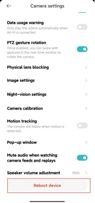You can restart the device in the camera settings in the Xiaomi Home App. Open Xiaomi Home App >> select [Device card] >> tap the three-dot icon at the upper right corner >> [Camera settings] >> [Reboot device].