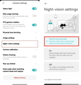 Open Xiaomi Home App >> select [Device card] >> tap the three-dot icon at the upper right corner >> [Camera settings] >> tap [Night-vision settings] >> you can choose [Full-color with low-light] or [Switch automatically] ([On], [Off]) as your preferences.