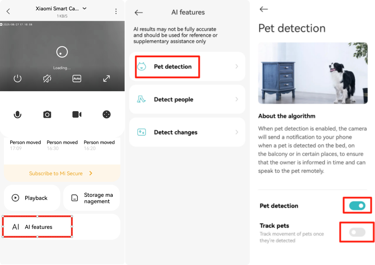 Please check if the human tracking and pet tracking features are enabled. You can check it in the following path: Open the Xiaomi Home App >> select the Xiaomi Smart Camera C201 >> tap [AI features] >> disable the tracking functions in either human detection or pet detection.