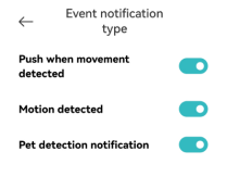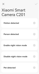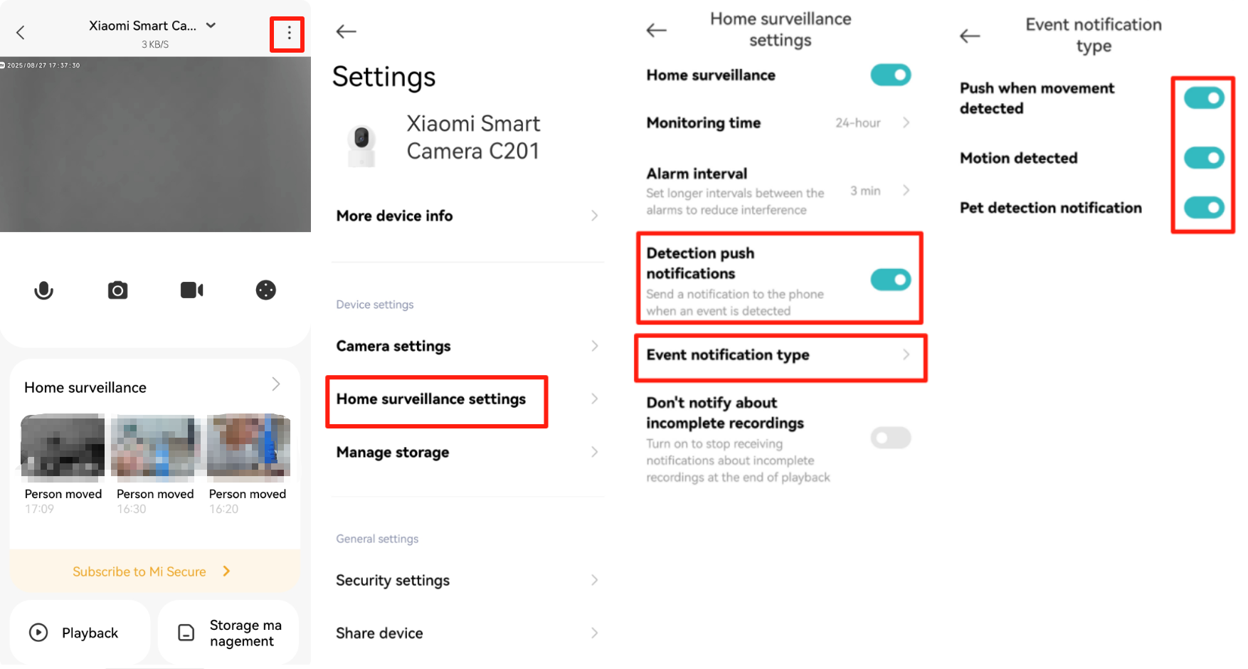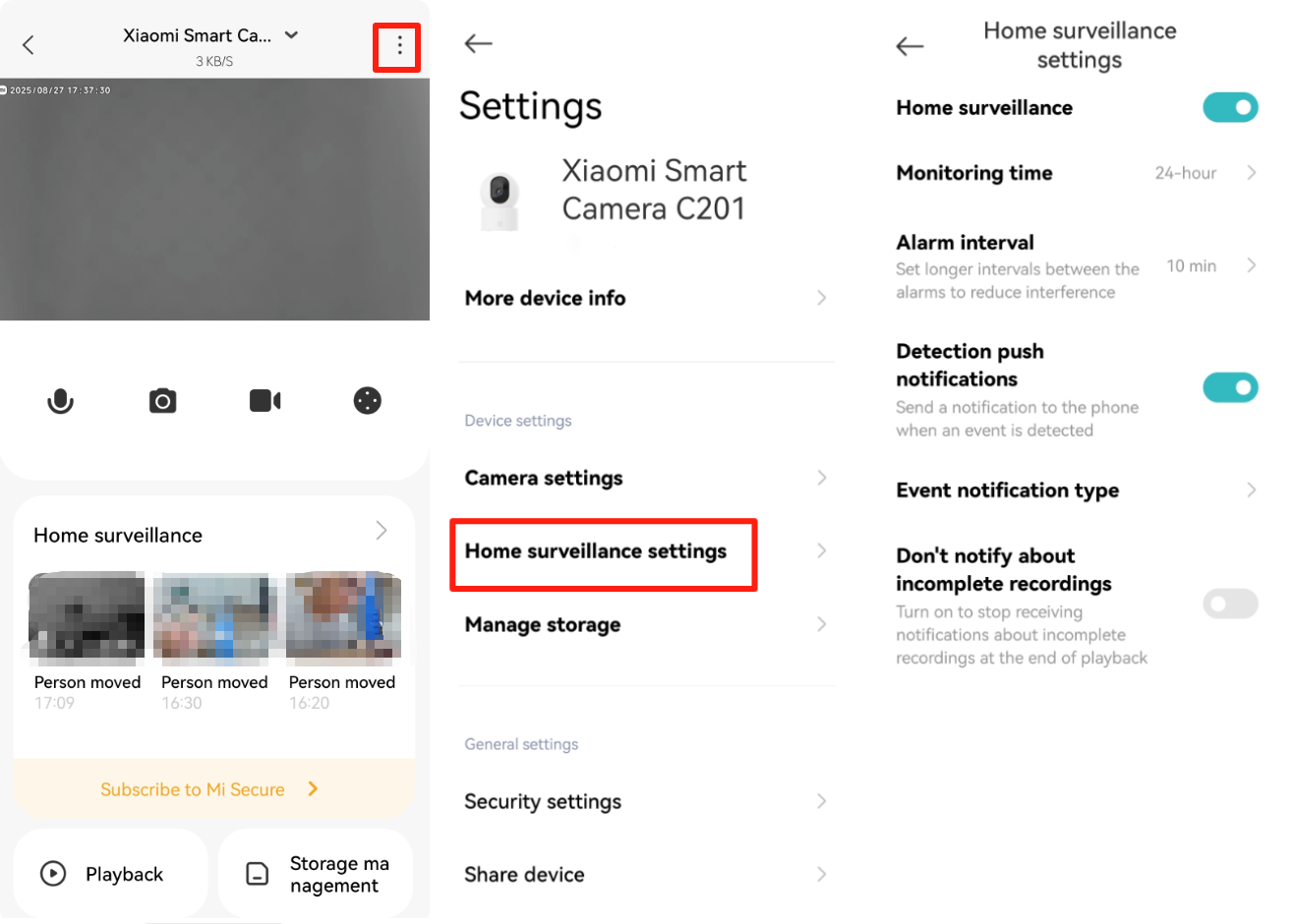 A: If the Xiaomi Smart Camera C201 has alarm video but no notification message, please open the Xiaomi Home App >> select the [Device card] >> tap the three dots icon at the upper right corner >> verify if [Home surveillance] and [Event notification type] are turned on.