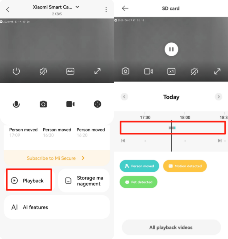 In addition, each time you enter the Xiaomi Smart Camera C201 monitoring screen or enter the cloud storage, the playback interface for recordings on the memory card will be muted by default. If you need to play the normal sound, please tap the mute button to restore the sound.